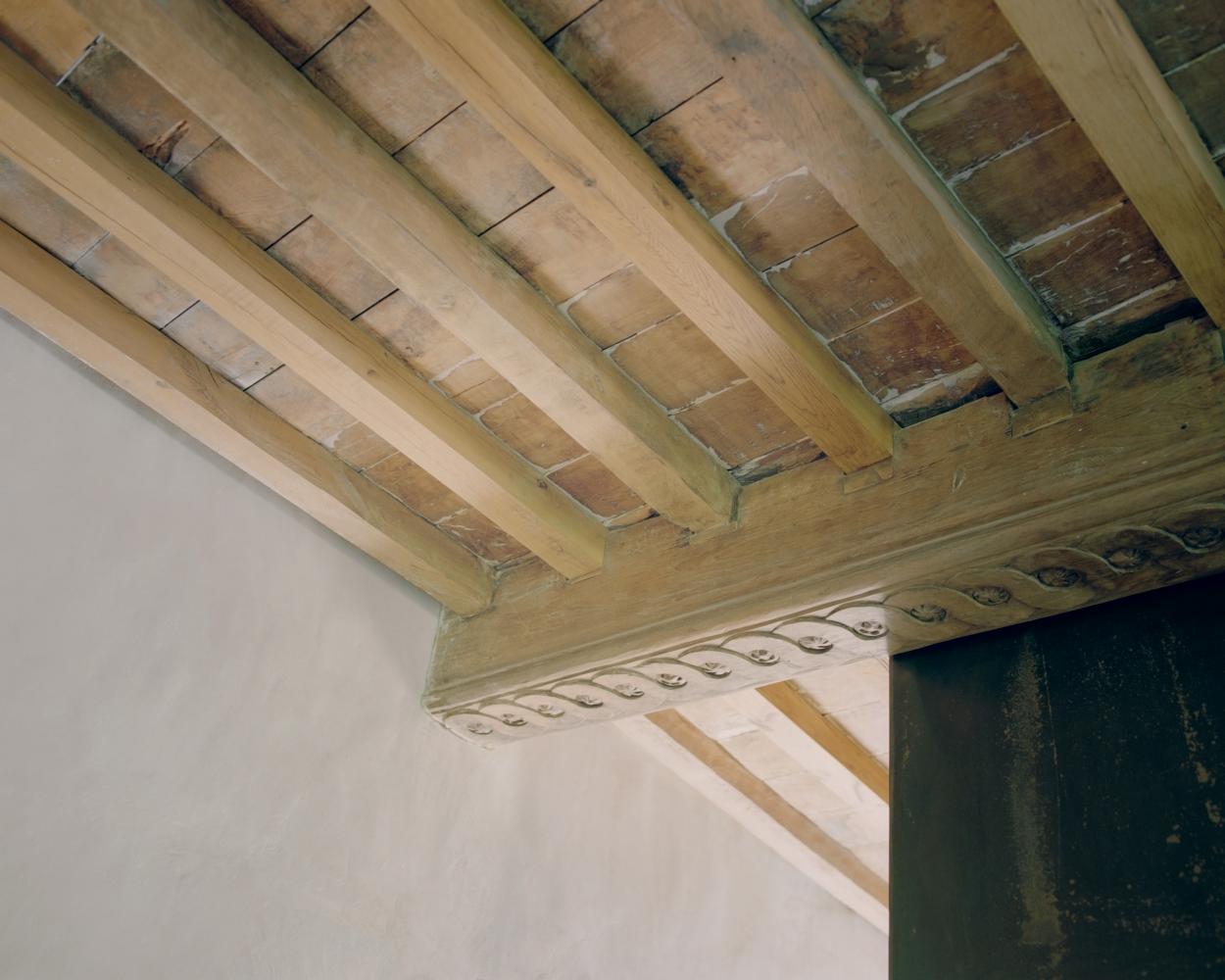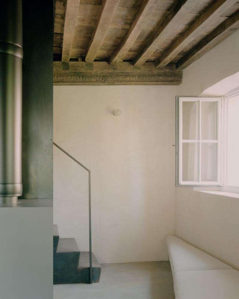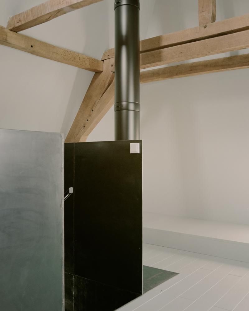 The stair tower contains heating, water techniques and electrical supply, as well as bathroom and kitchen, an office, a stove and the, for the region obligatory, wine fridge.
