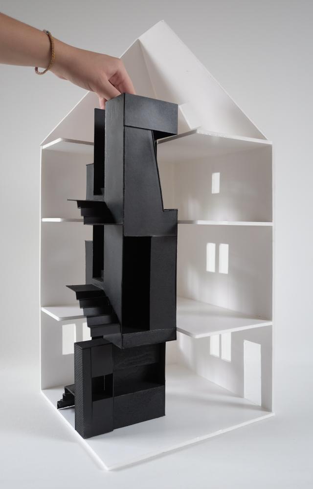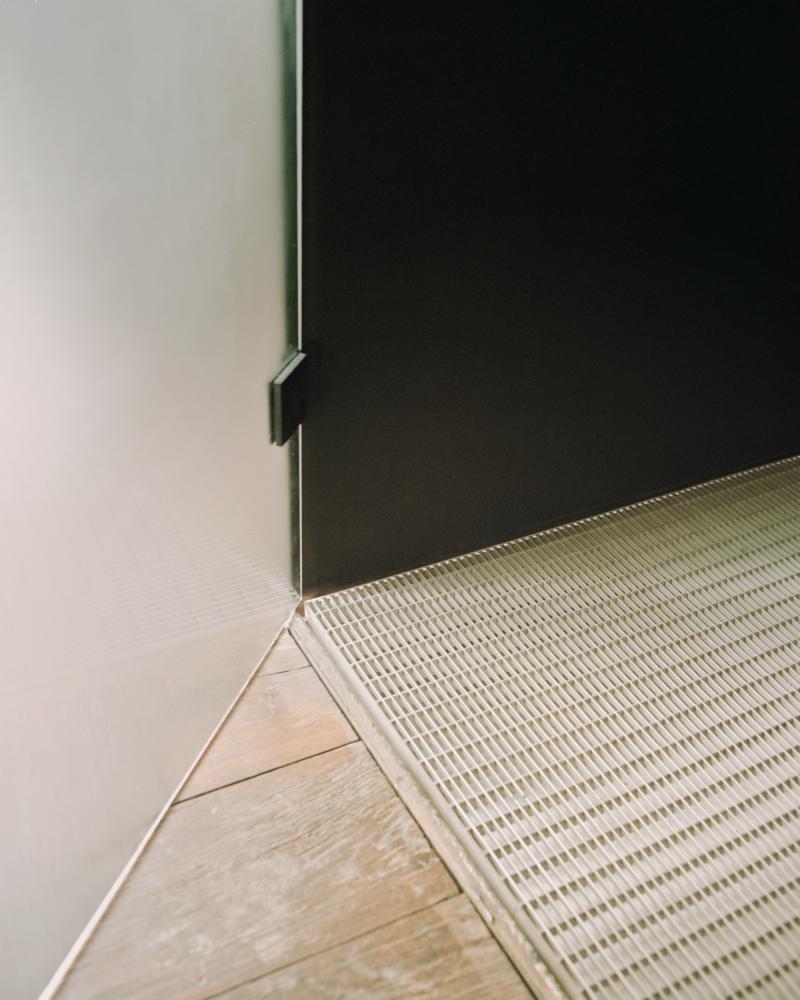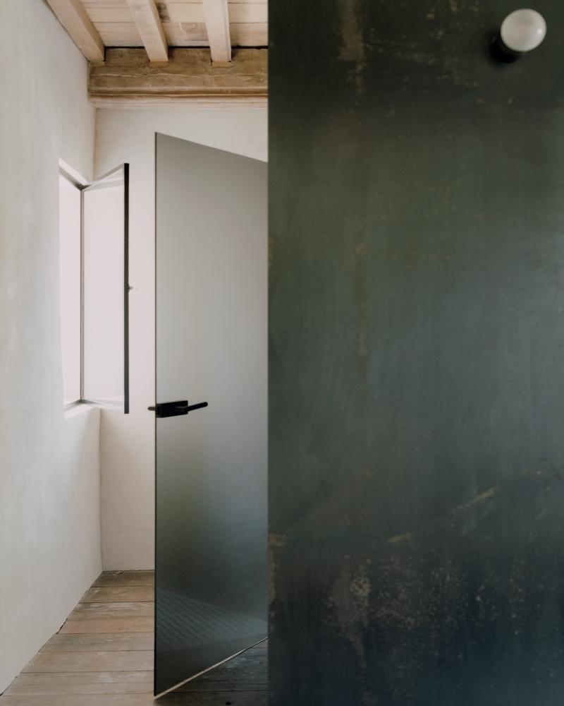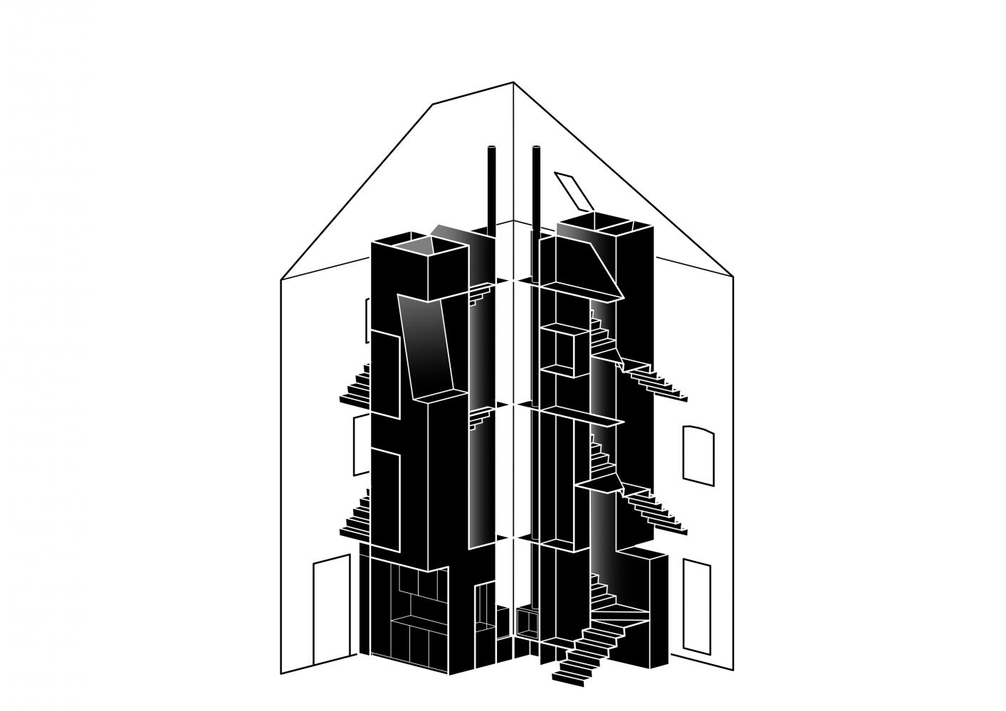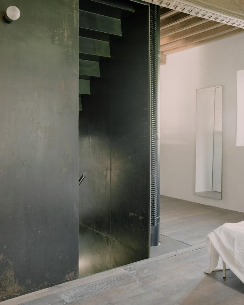 The tower is welded together on site in 12 mm solid steel and is both structural and architectural. Diverse functions and room layouts are thus organized over four floors and in the smallest possible space.