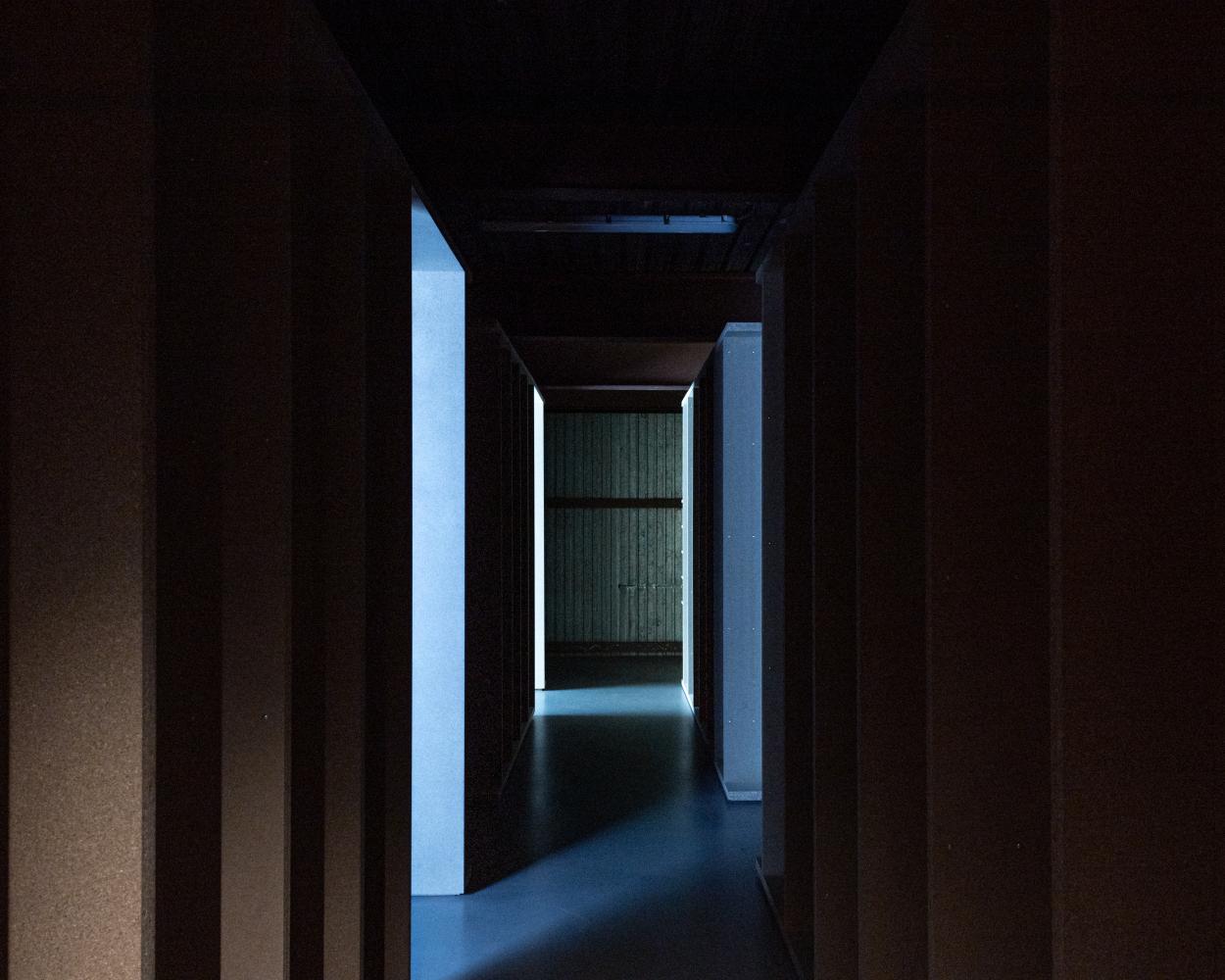 Inciting an iterative visiting promenade and not a preset trajectory, the box-buildings, which are domestic-sized rooms, open in diverse ways and enable various video formats and ergonomic relations.
