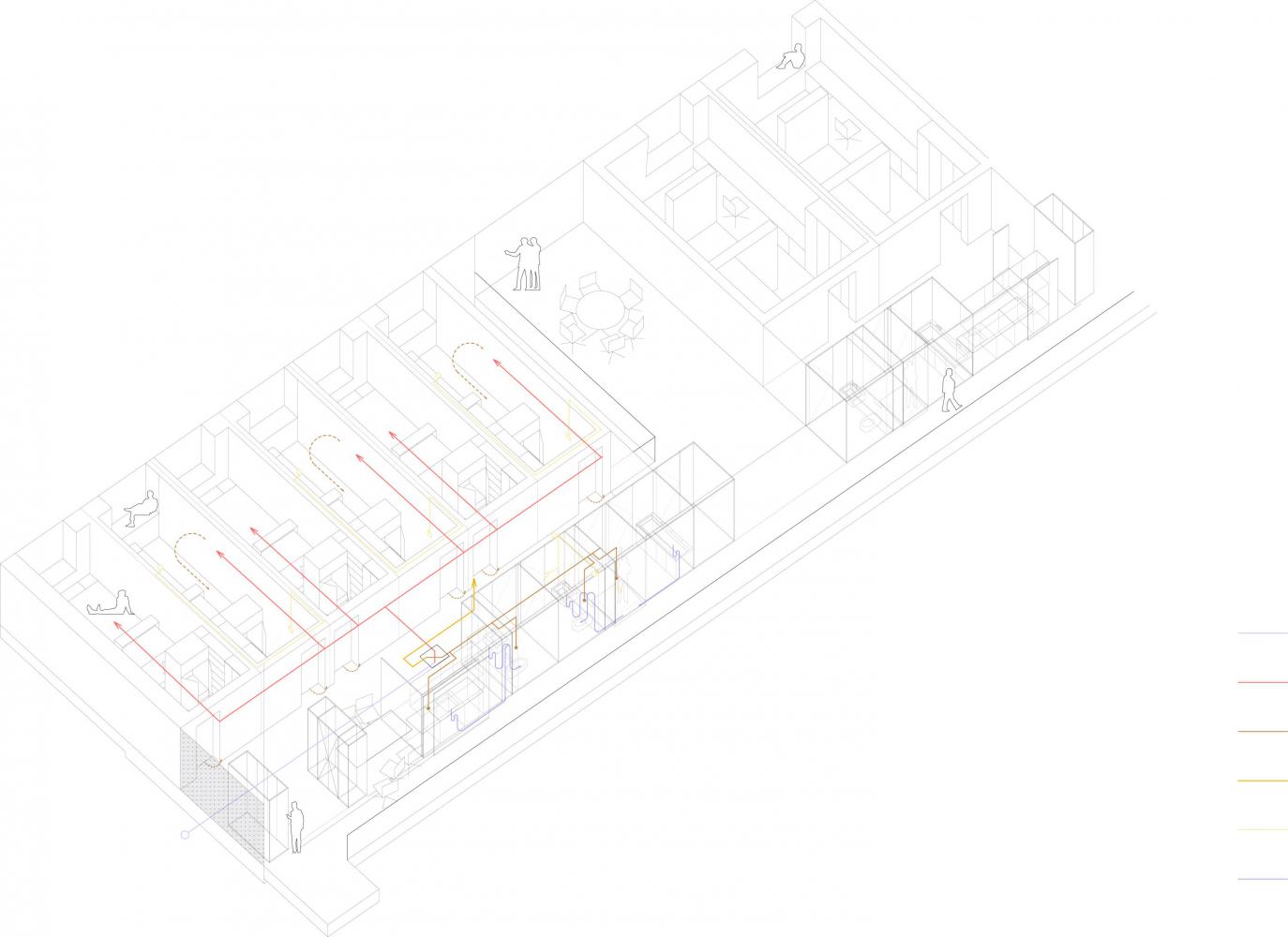 Inside, a narrow translucent glass strip integrates the shared functions of bathrooms and kitchens, physically splitting the grouped units from the public corridor, while enabling different usage scenarios.