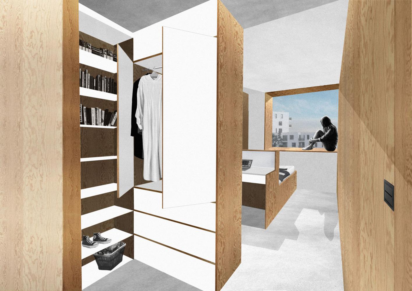 The individual rooms are ergonomically dimensioned and made out of prefabricated solid wood containers, which benefit from large openings that can be used as extended furniture.