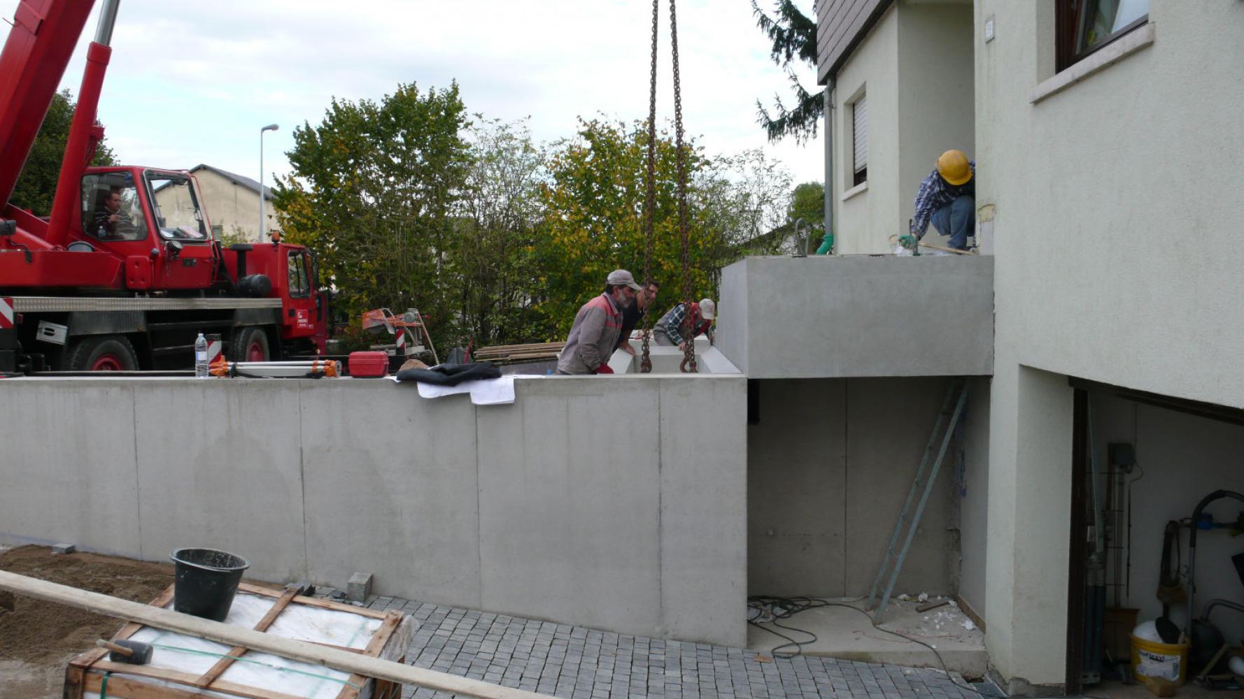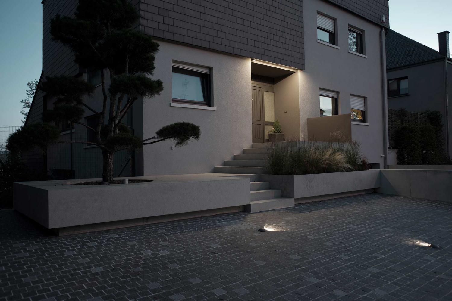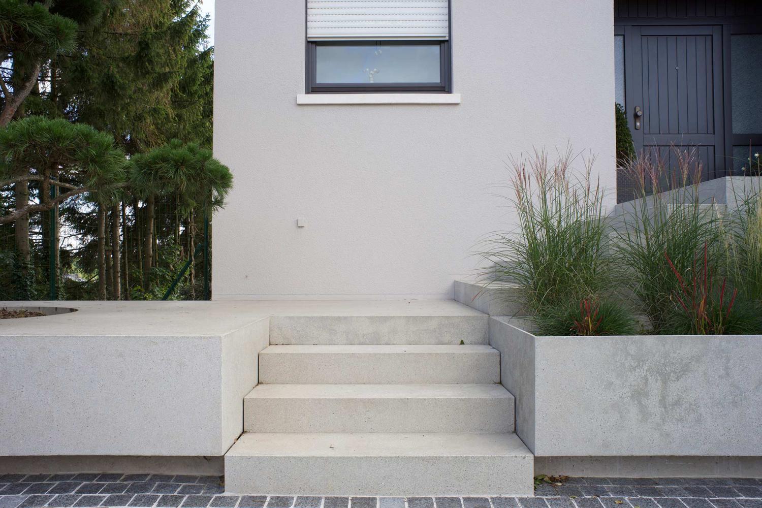 Insatisfaits des escaliers frontaux et encombrants et de leur état de détérioration, les clients ont demandé une nouvelle situation d'entrée à leur maison unifamiliale de banlieue des années 1980.