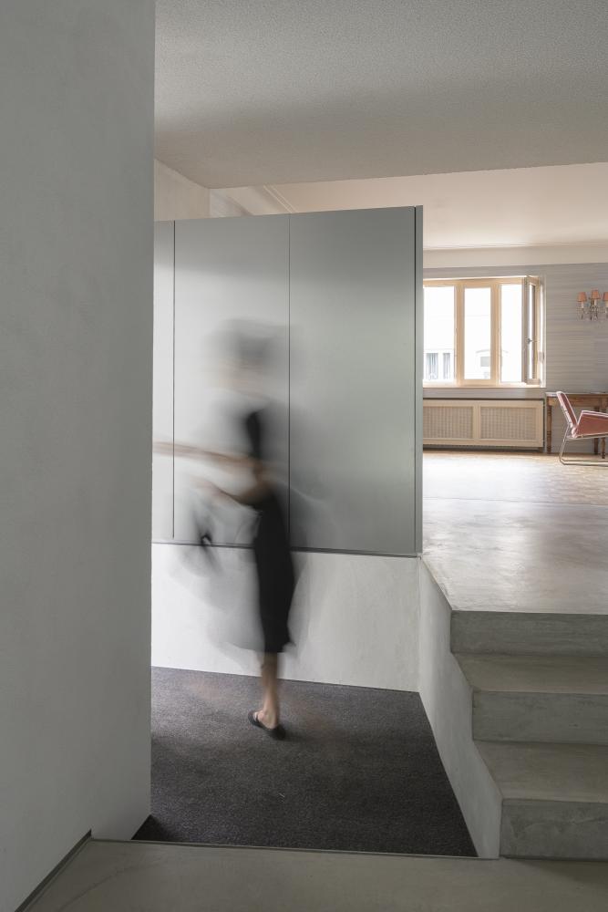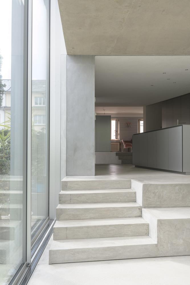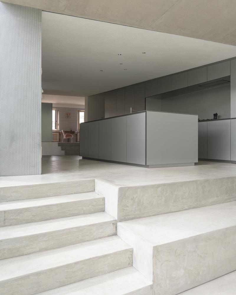 The modest terrace and winter garden were removed, along with a portion of the rear floor slab. In their place, a simple cubic volume was inserted. Inside, the new floor was articulated as a sequence of three stepped levels; descending from the living room, through the kitchen, and down to a dining and second living area on the garden level.