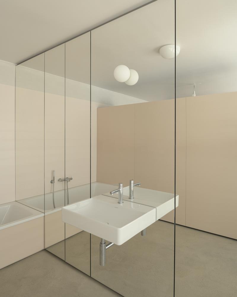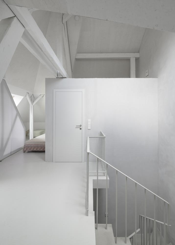 Like a crocodile opening its mouth wide, the house stretches out toward the north-facing garden, both in plan and in section. Sloped ceilings accommodate technical systems and resolve structural challenges, while the plan integrates kitchen fittings and secondary functions (storage, toilet) with subtle precision. What remains is a clean, open space, culminating in a lush, private garden, sheltered beneath a hovering concrete volume.
