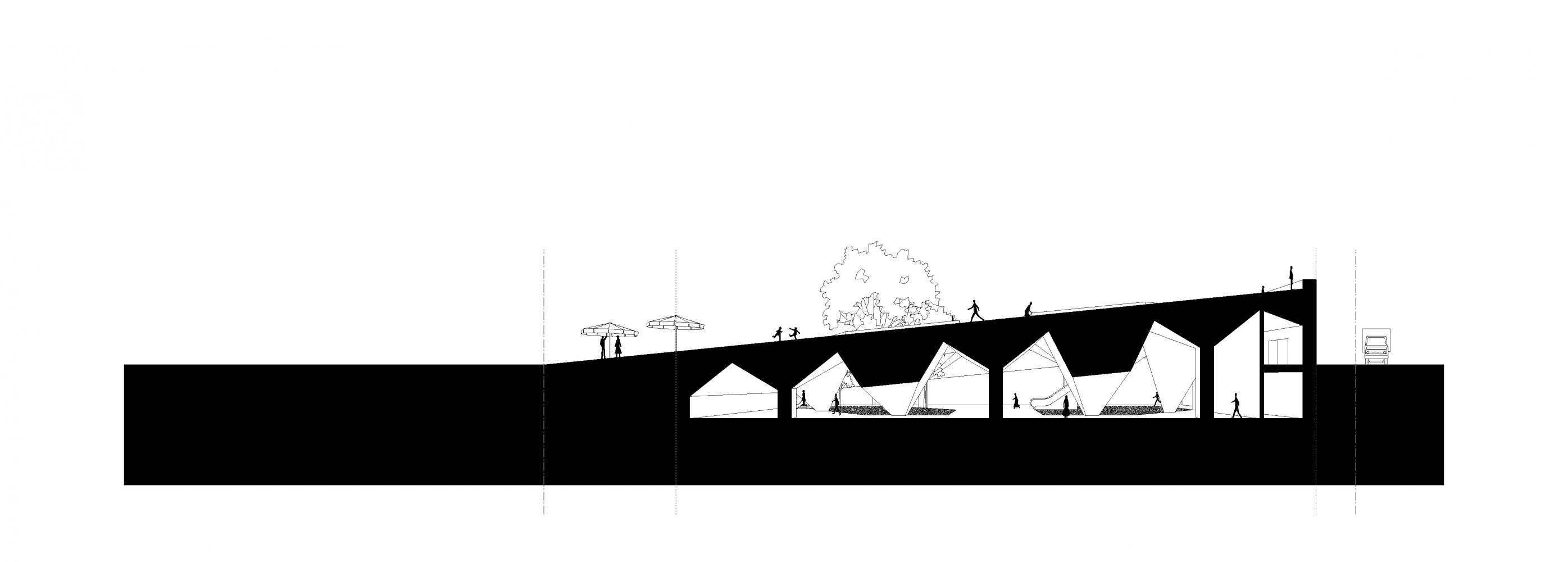 A gently sloping public space rises from the main street layout of the expo masterplan. It enables the visitor to emancipate from the crowded circus and the expressive constructions.