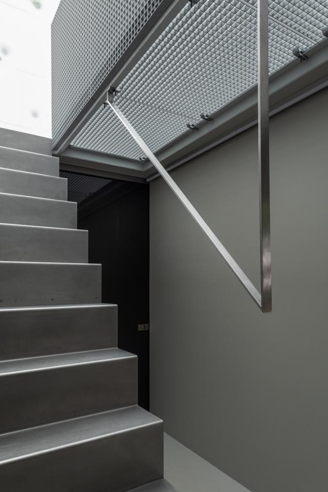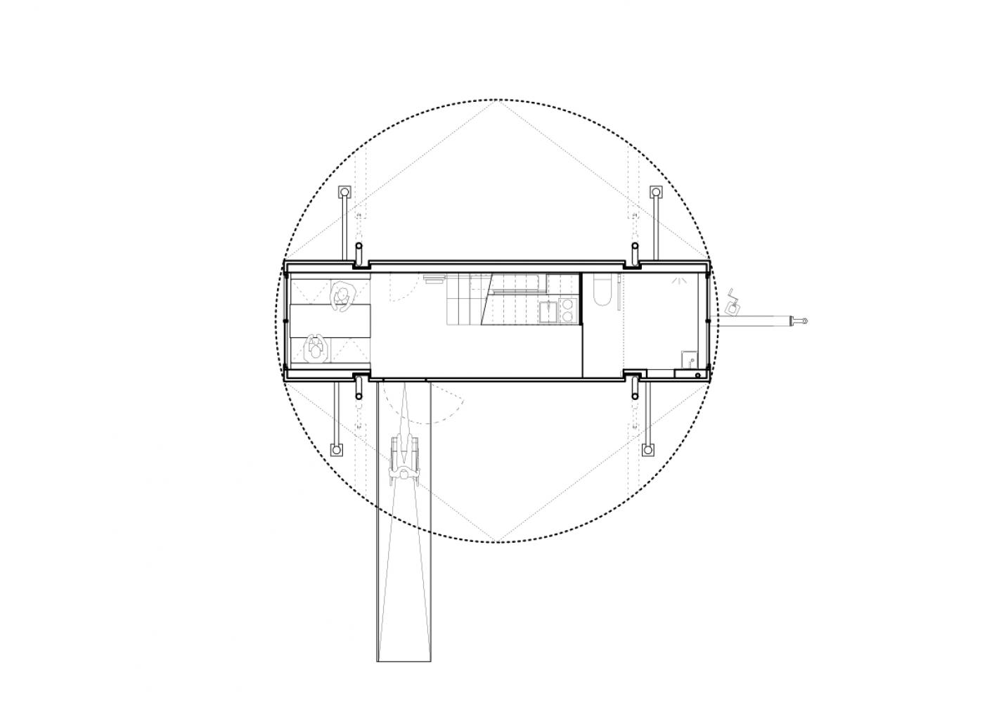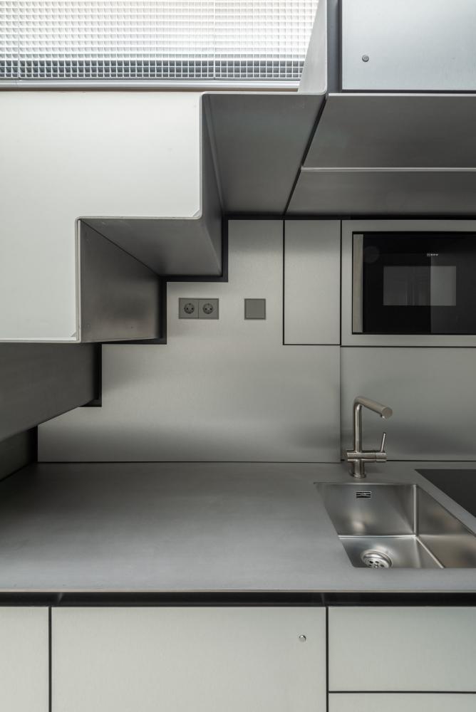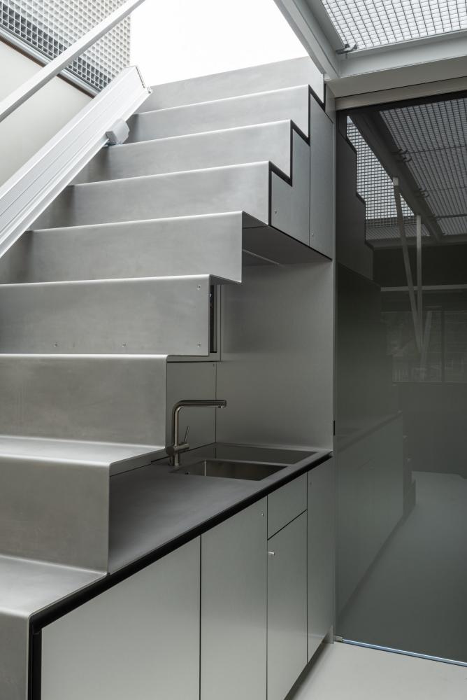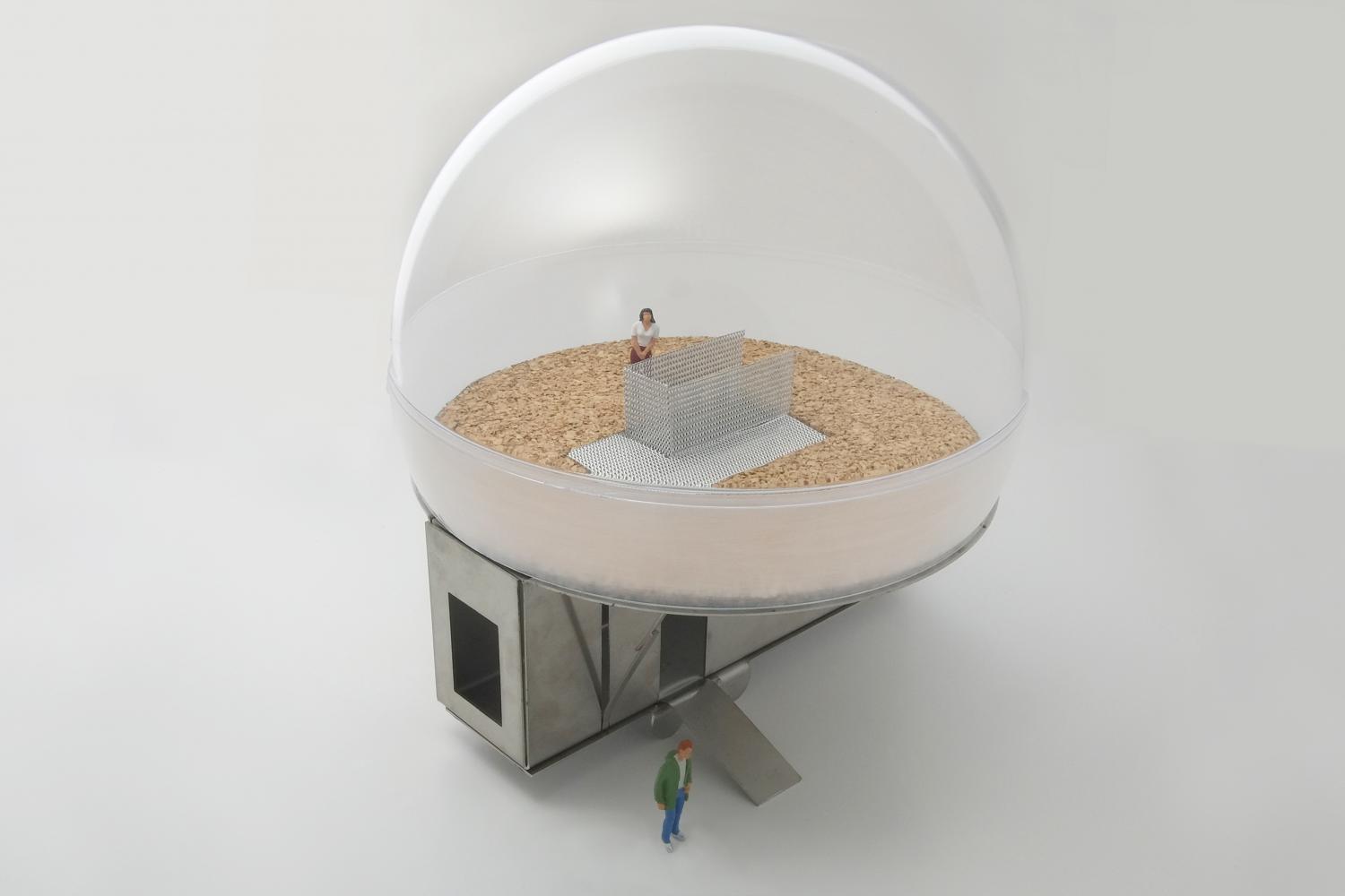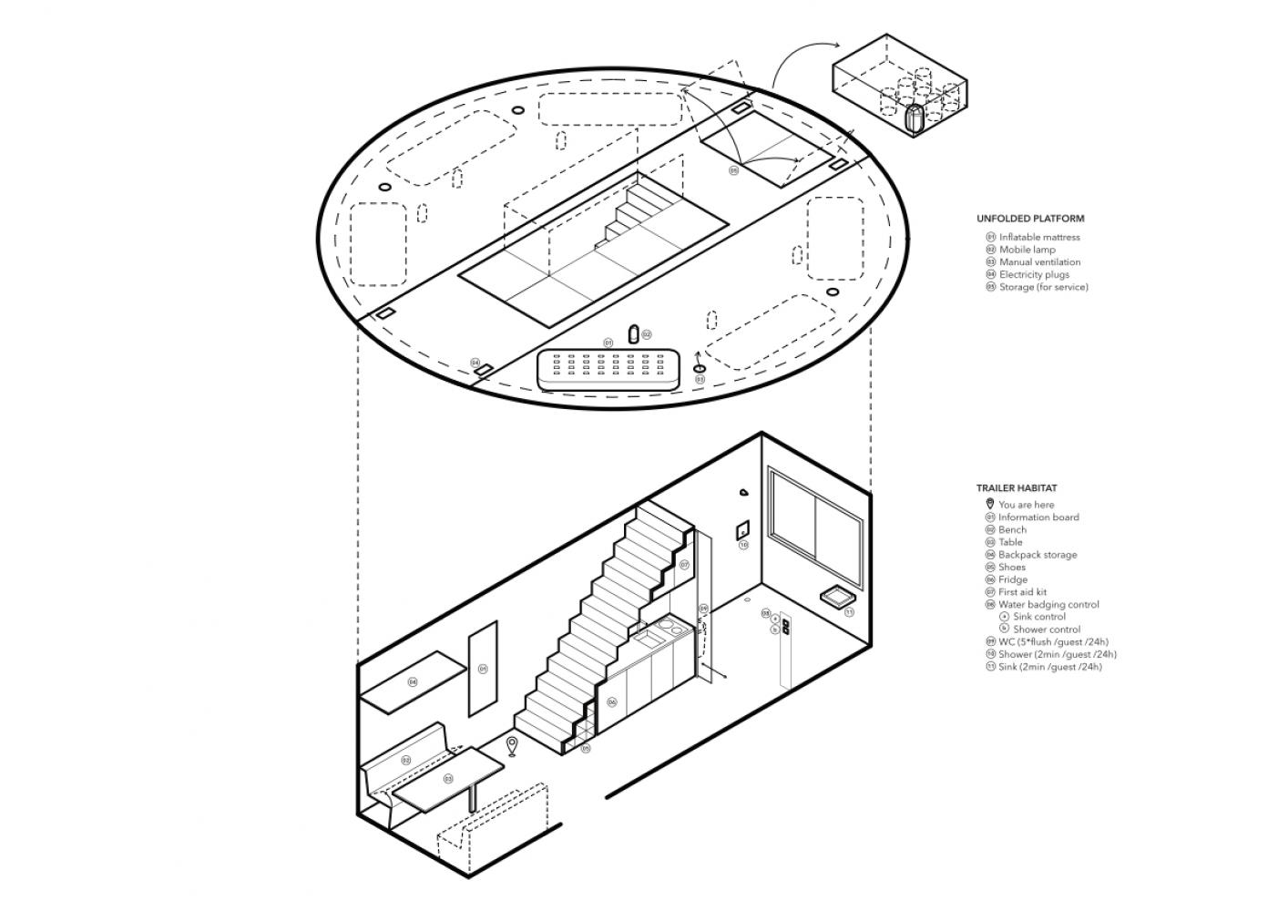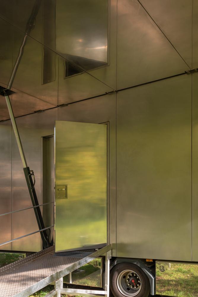 In mobile setting, the space station is reduced to a stainless steel trailer, containing bath, kitchen and dining space.