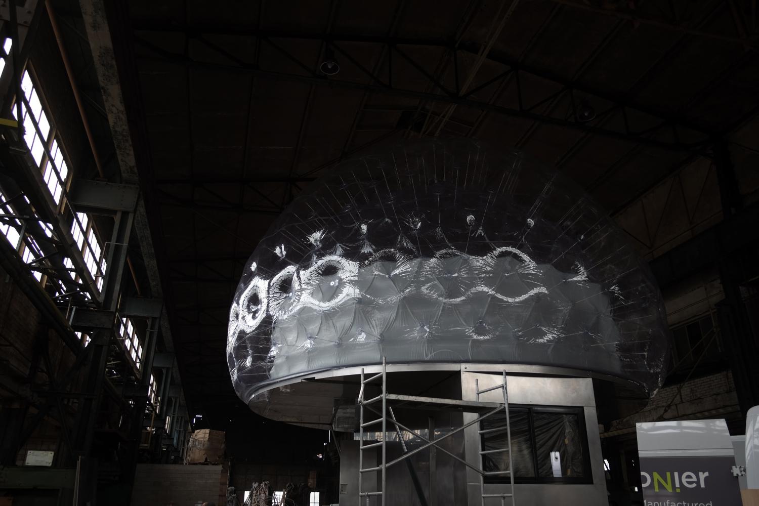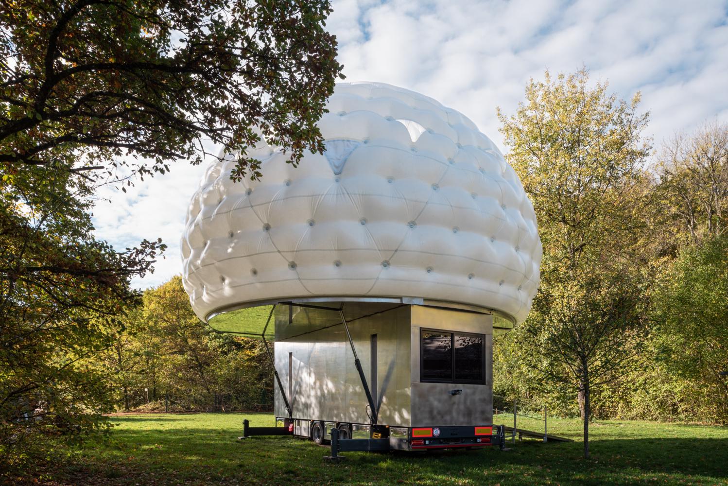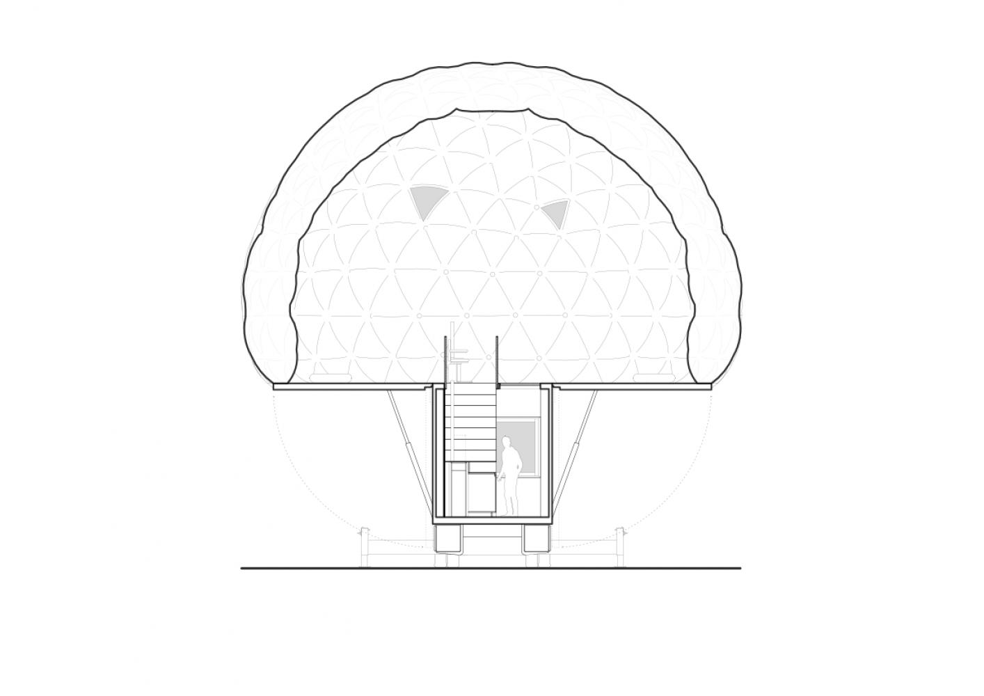 On this platform, a double-shell pneumatic dome is inflated to form the generous sleeping habitat.