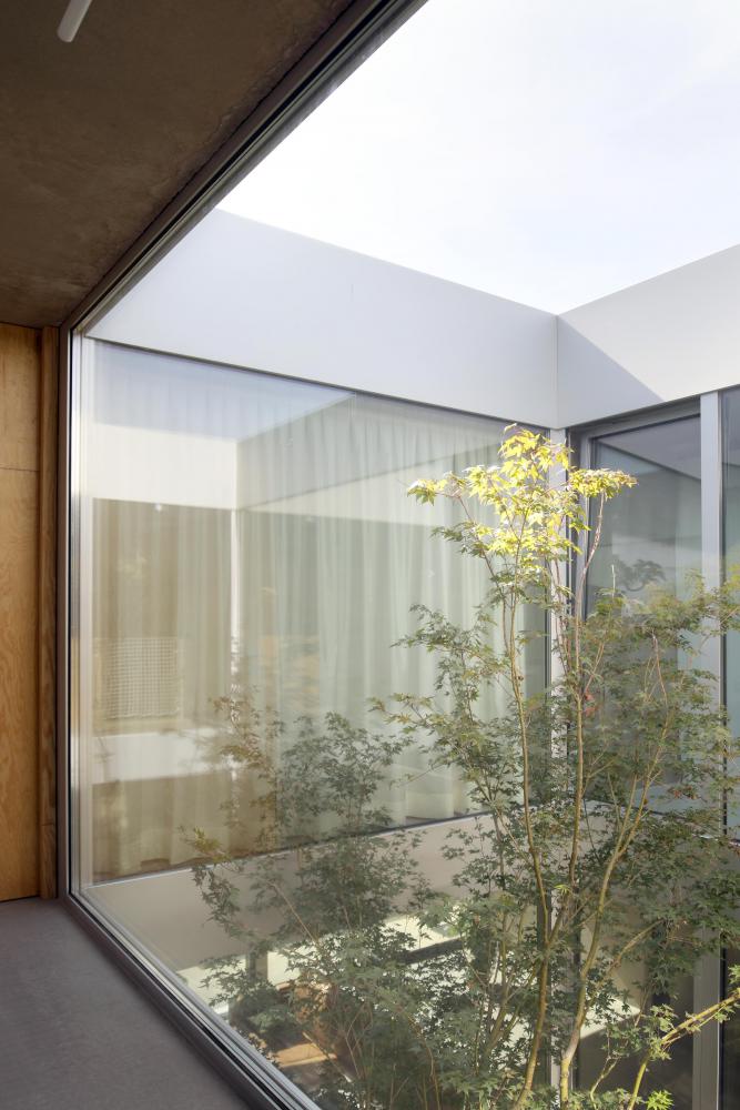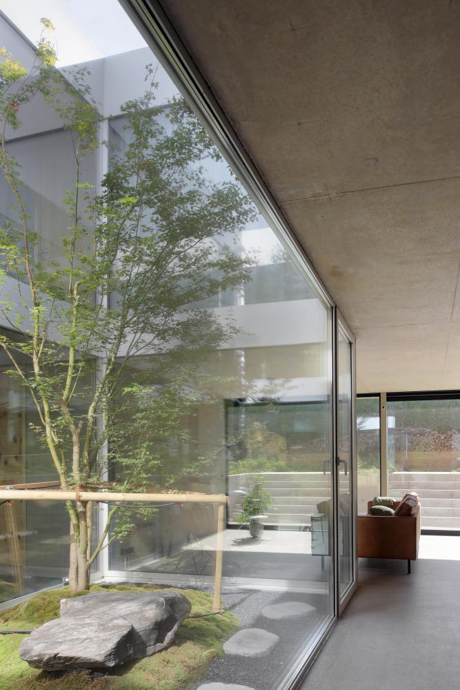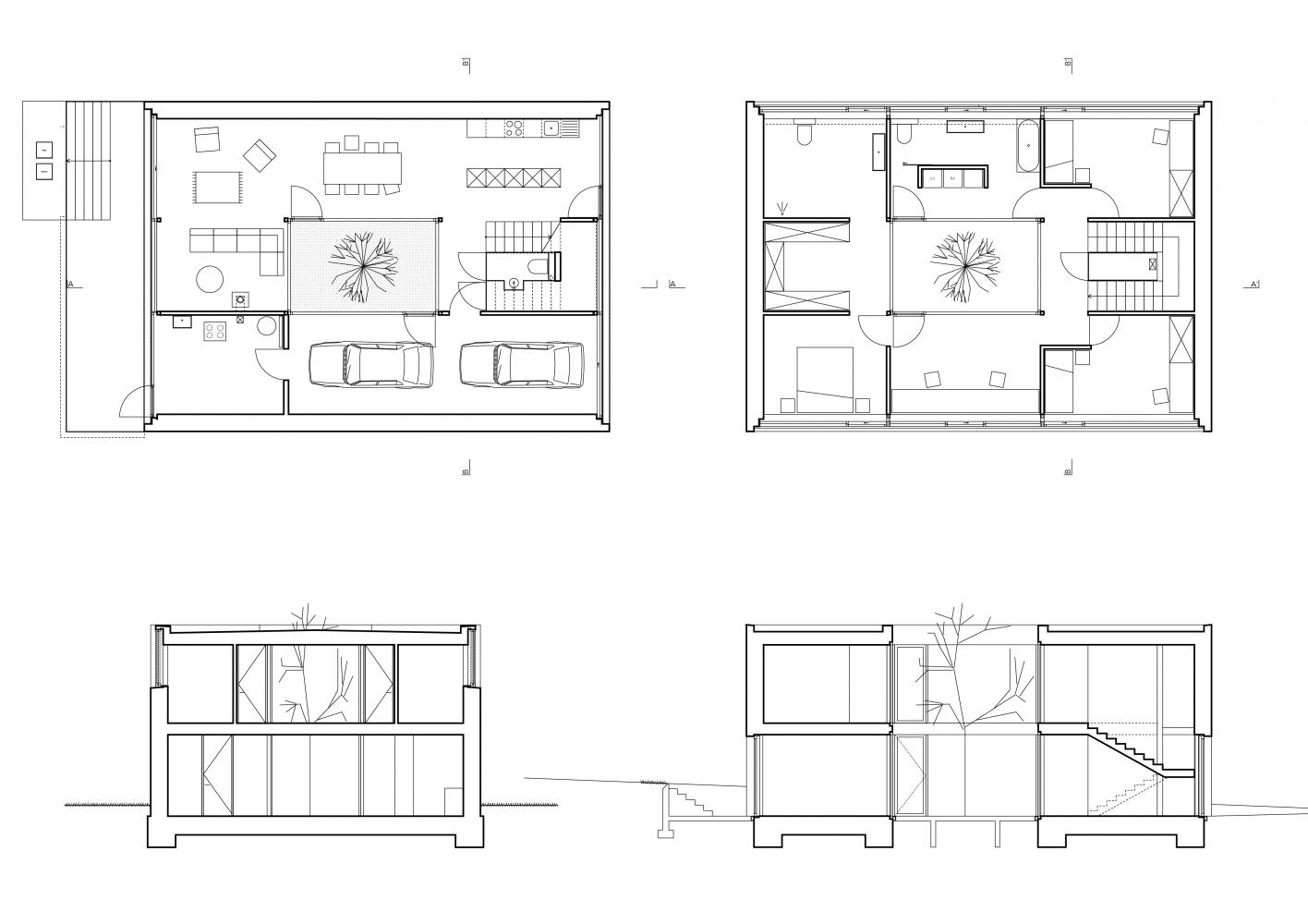 The ambitious program is broken down into a tic-tac-toe grid, introducing a rigorous structure to the plans. The various domestic functions are orbiting around a central patio, enabling an introverted and intimate relation to the immediate context.
