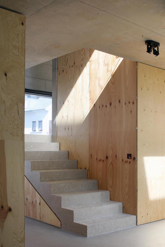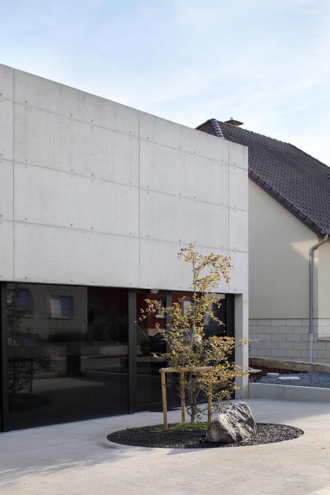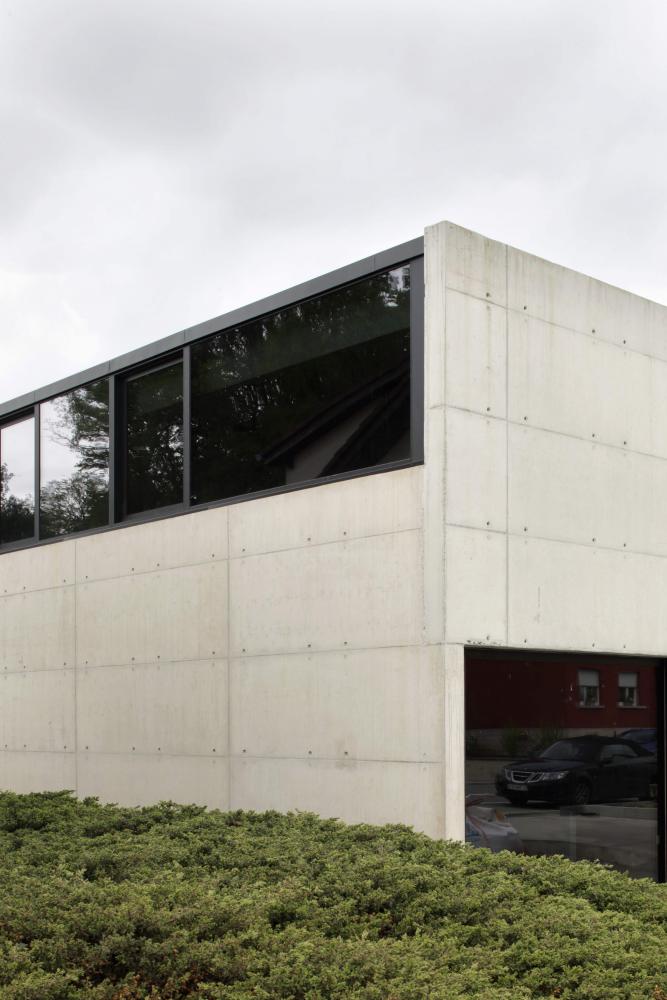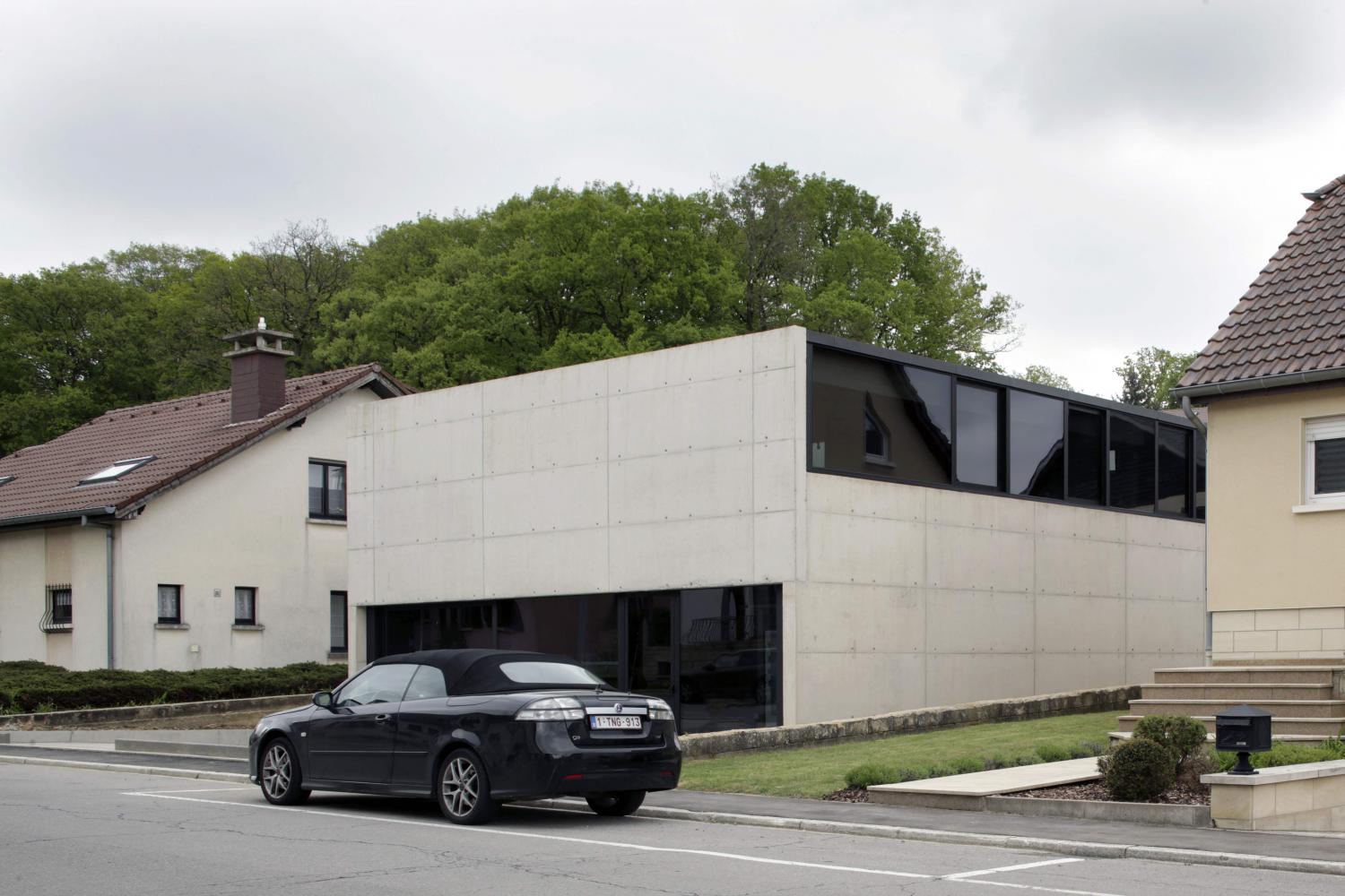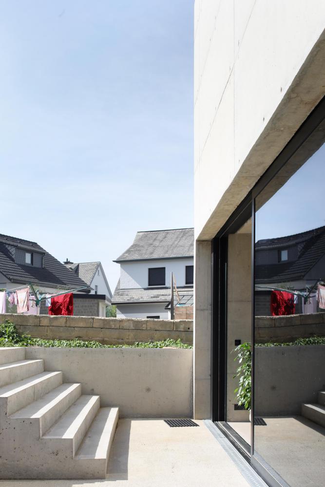 On the ground floor, 2 concrete slabs run north to south, where they open north towards the street with a garage, an entrance, the stairs and a kitchen, all in a single window frame element. To the south, the living areas spread between the slabs and open to a terrace.