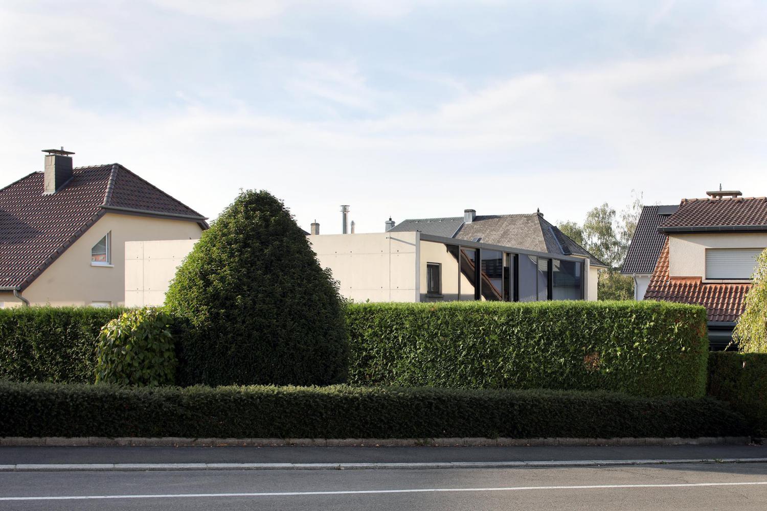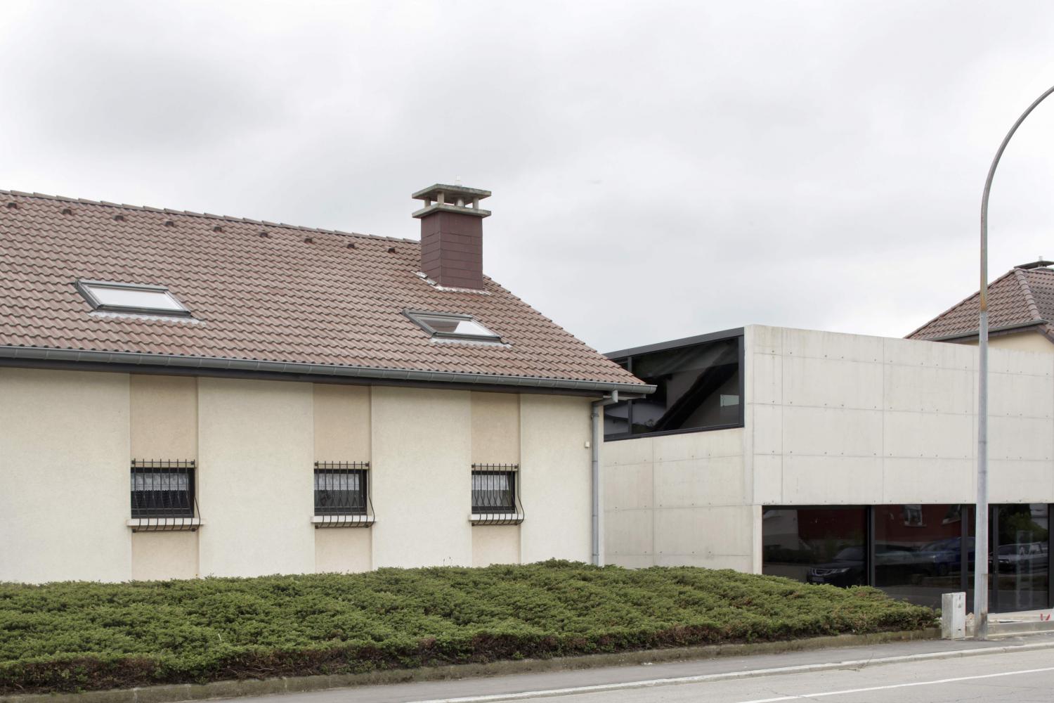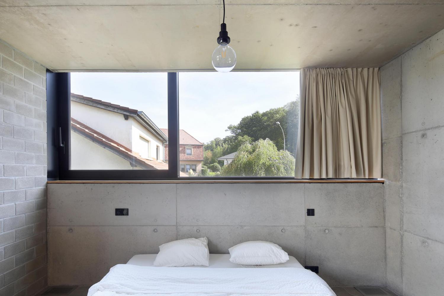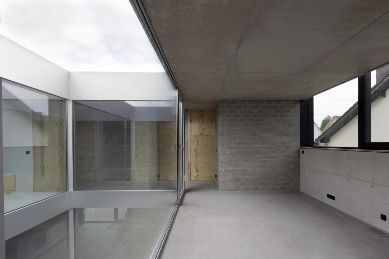 On the ground floor, 2 concrete slabs run north to south, where they open north towards the street with a garage, an entrance, the stairs and a kitchen, all in a single window frame element. To the south, the living areas spread between the slabs and open to a terrace.