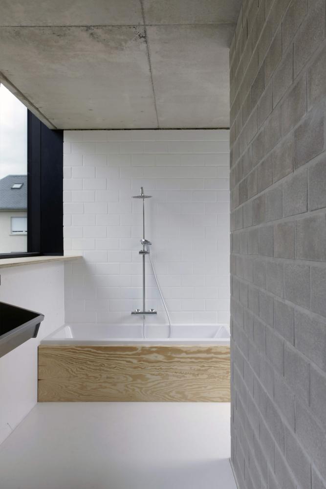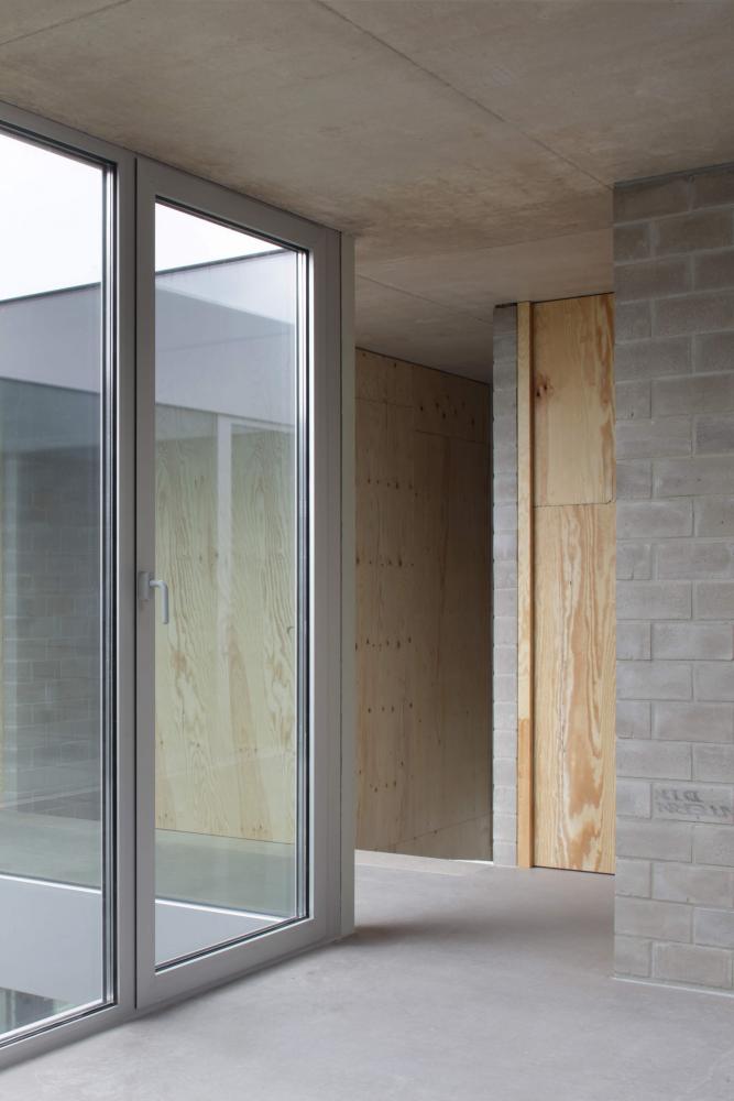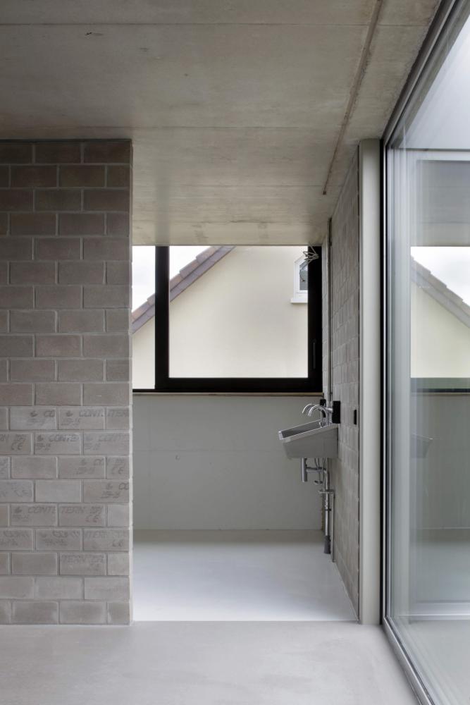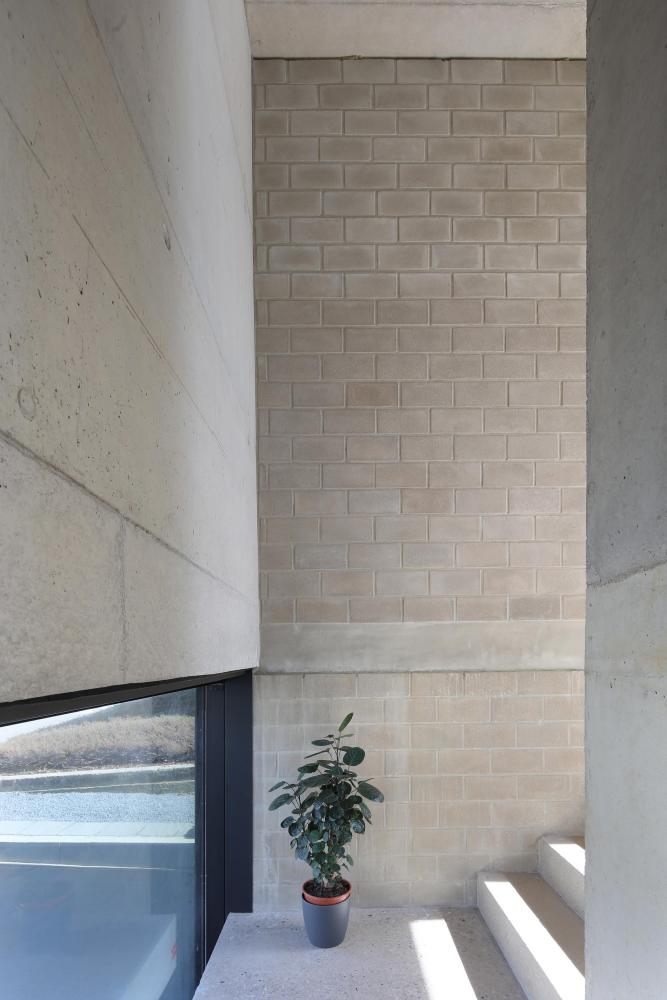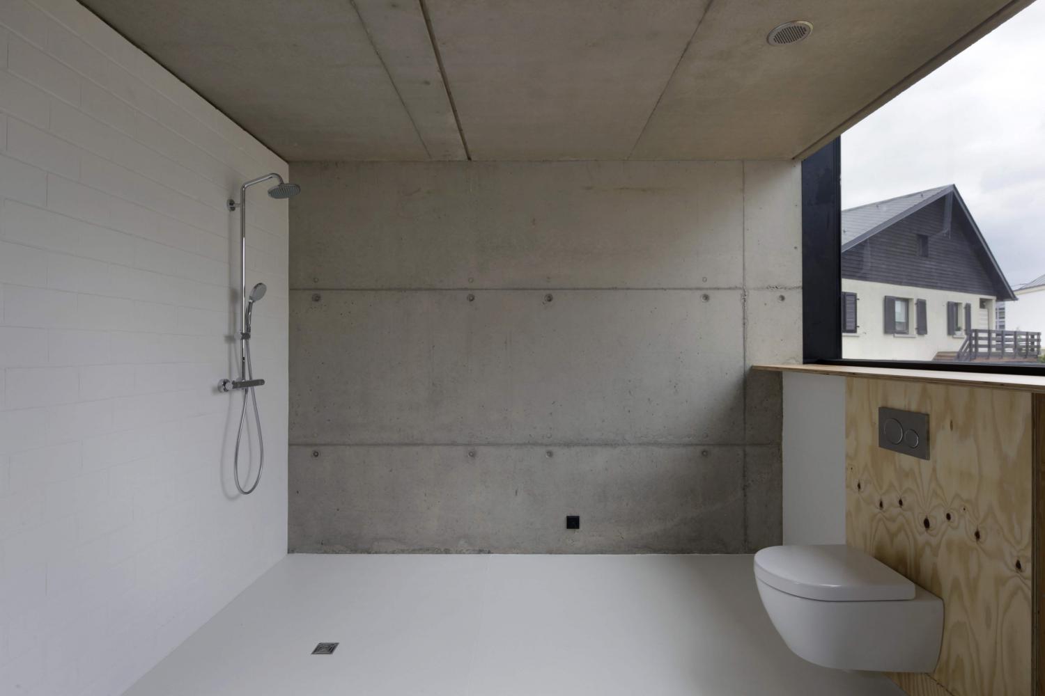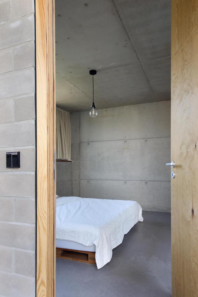 On the first floor, where sleeping-and bathrooms are located, the walls from below are still visible, creating the windowsills and structural stiffening. 2 additional blind concrete slabs, which work as giant beams for the ground floor openings, run east to west, giving a preferred orientation to the rooms