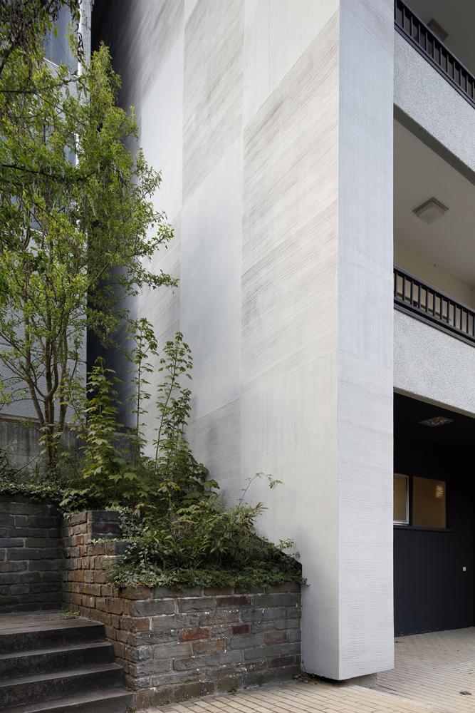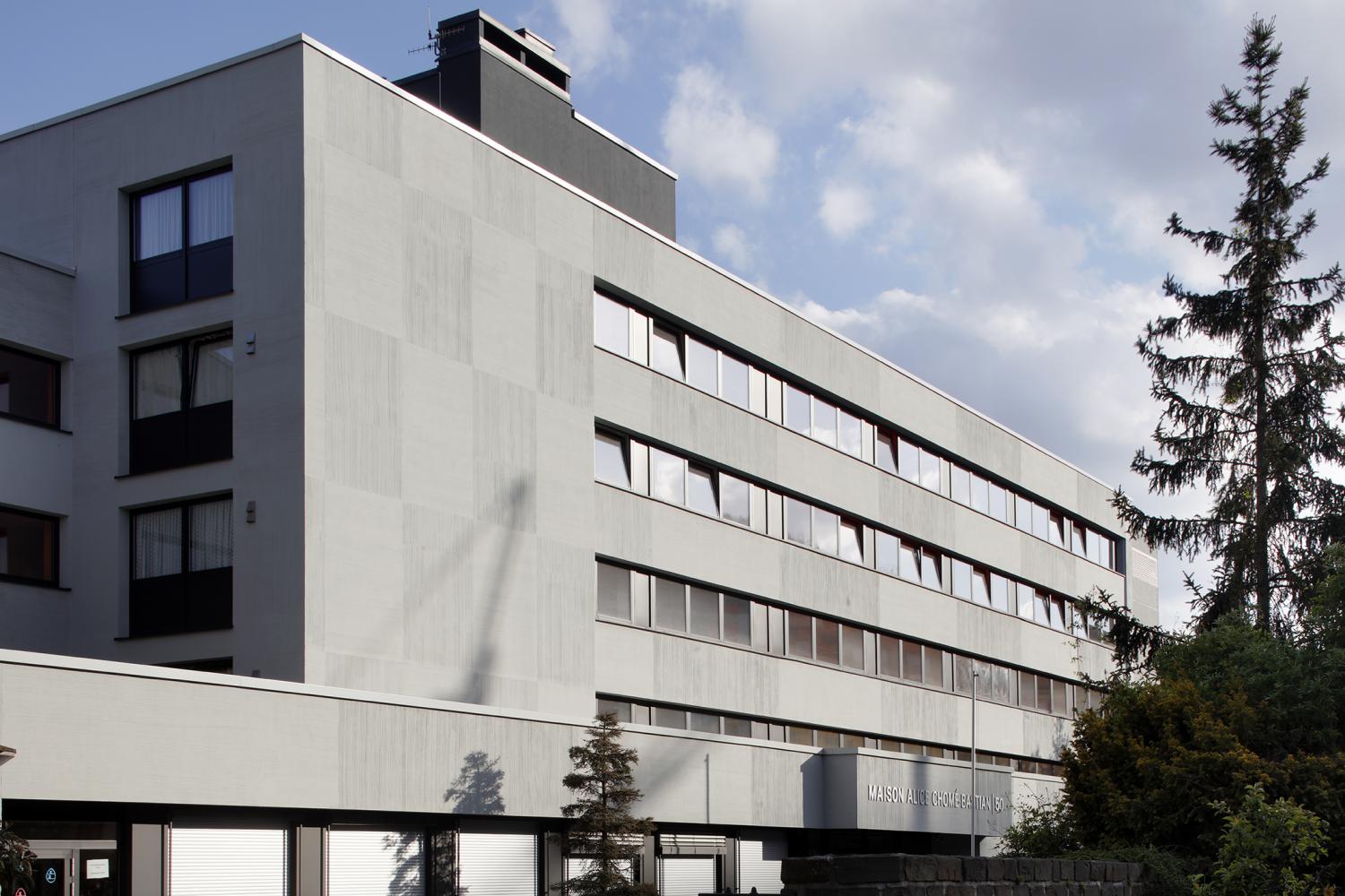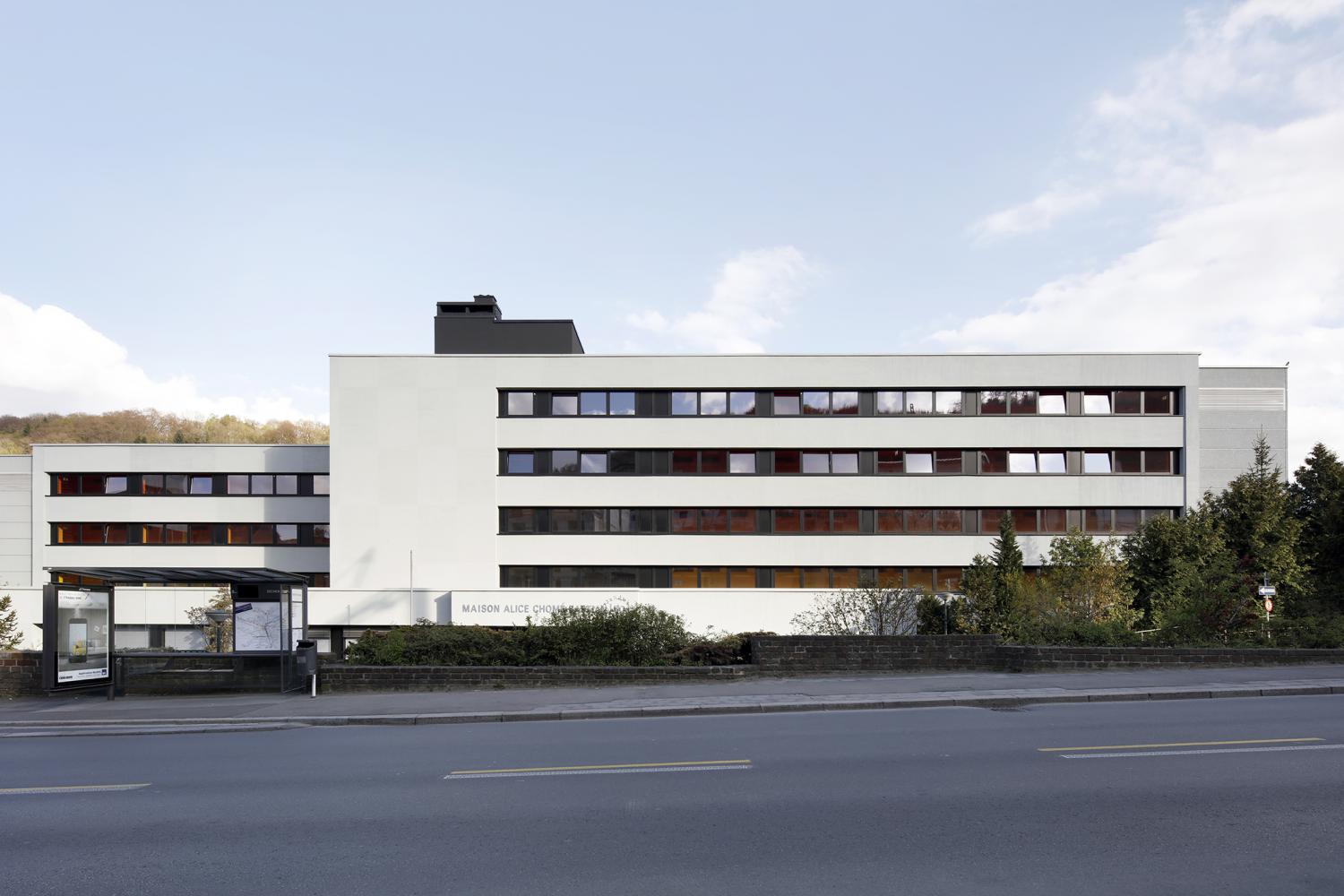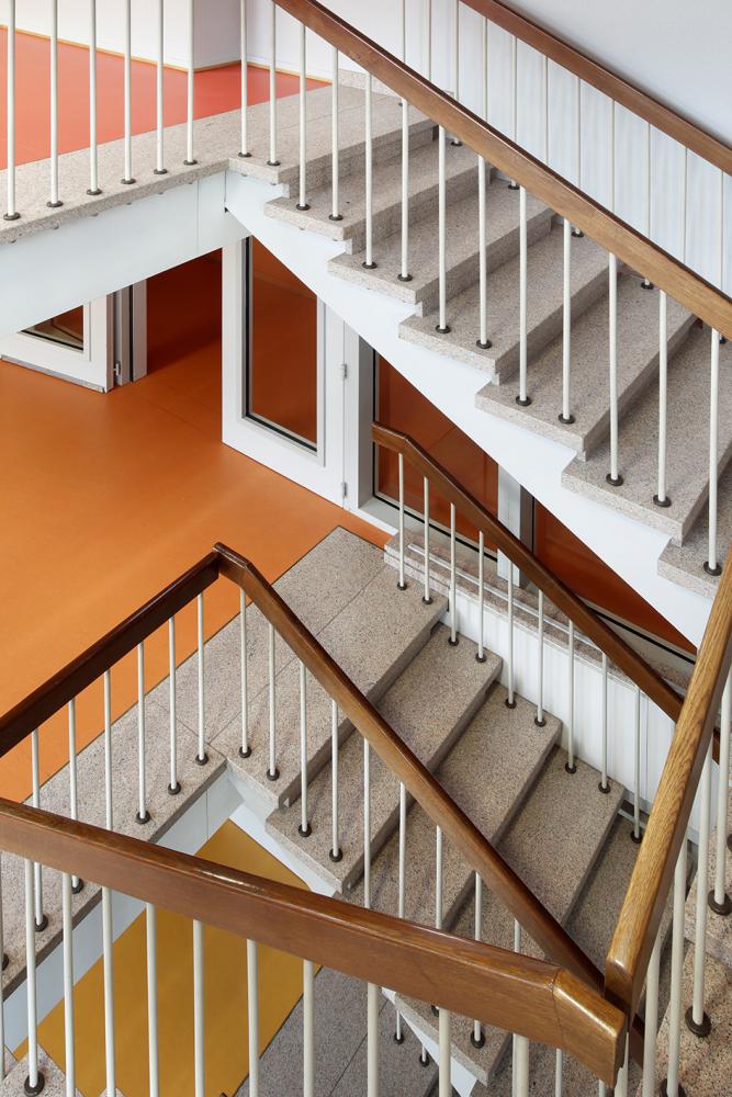 Complementary to the energetic renovation, the project consists of transforming an elderly home into student housing. Through a curatorial approach of redesigning the semi-public spaces, the inherent spatial qualities of the original project were preserved while simultaneously creating new atmospheres linking the building to youth culture. Furthermore, in accordance with the location and perception of the building, a system of lo-tec dynamic façades was developed, resulting in an ever-changing face of the building through op-art techniques.