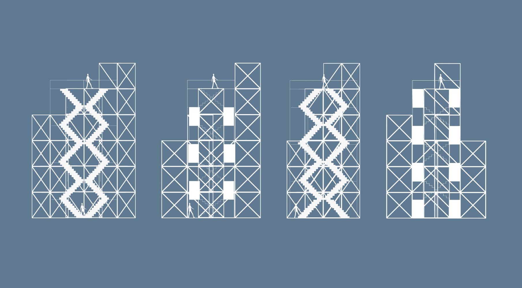 The scaffolding structure enables considerable dimensions while guaranteeing safety norms and avoiding the production of waste. The double-helix stair provides separate entrance and exit ways.