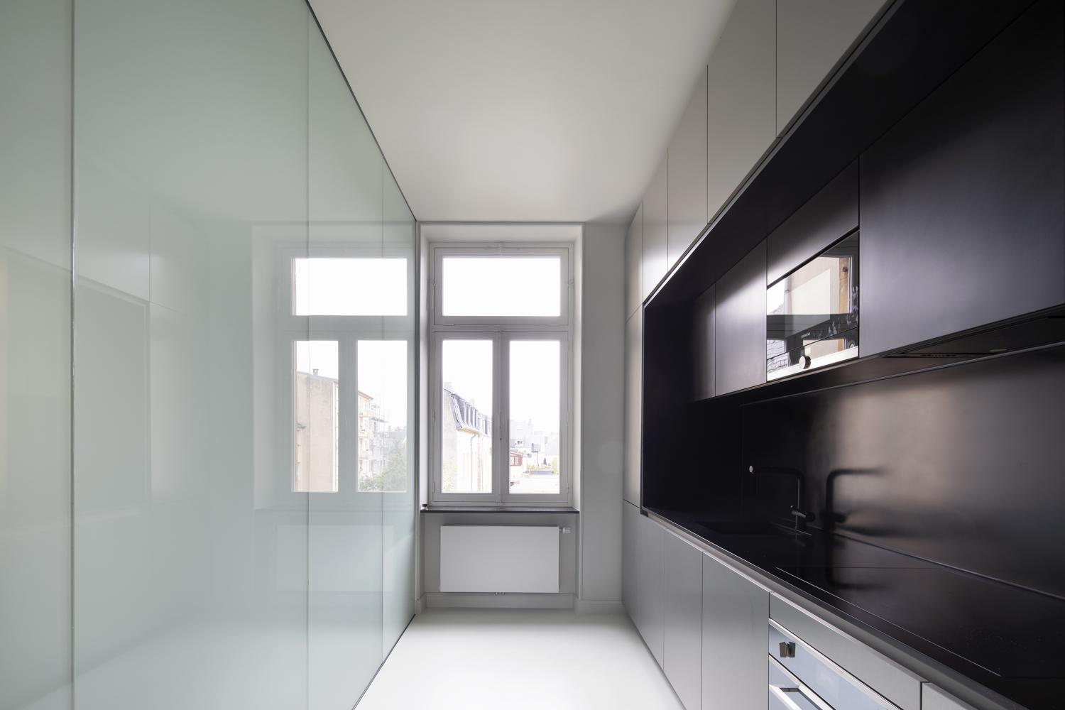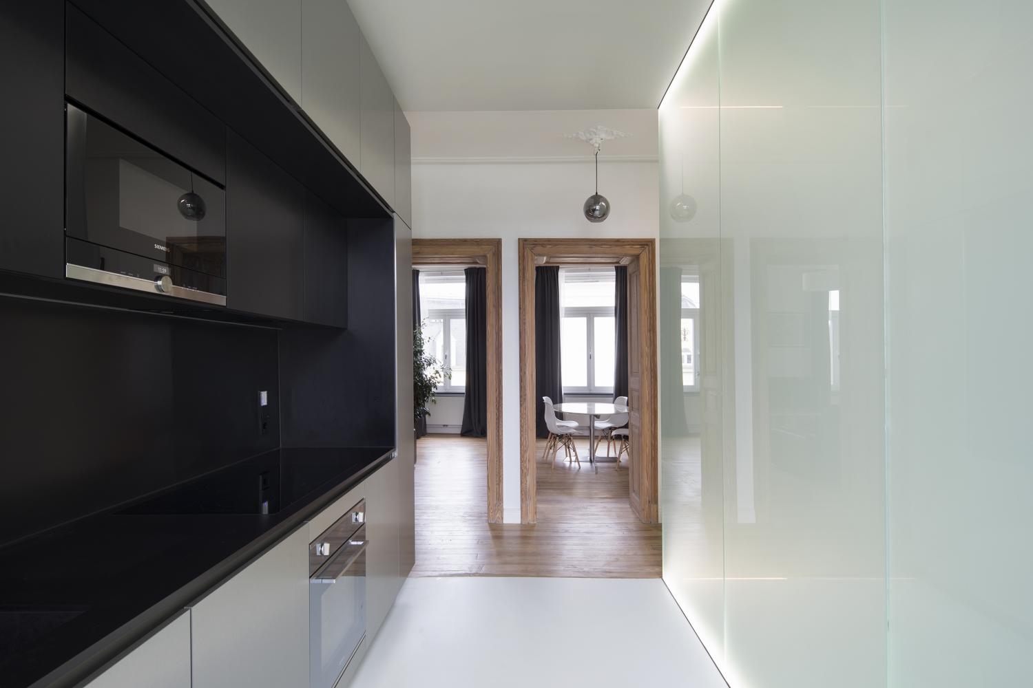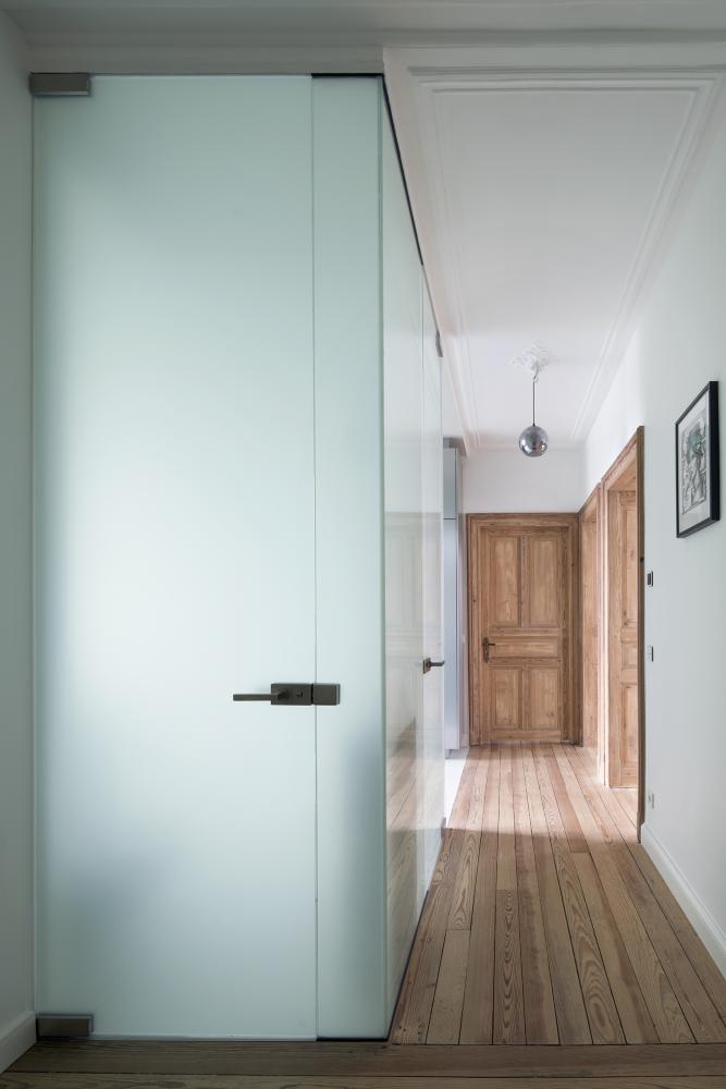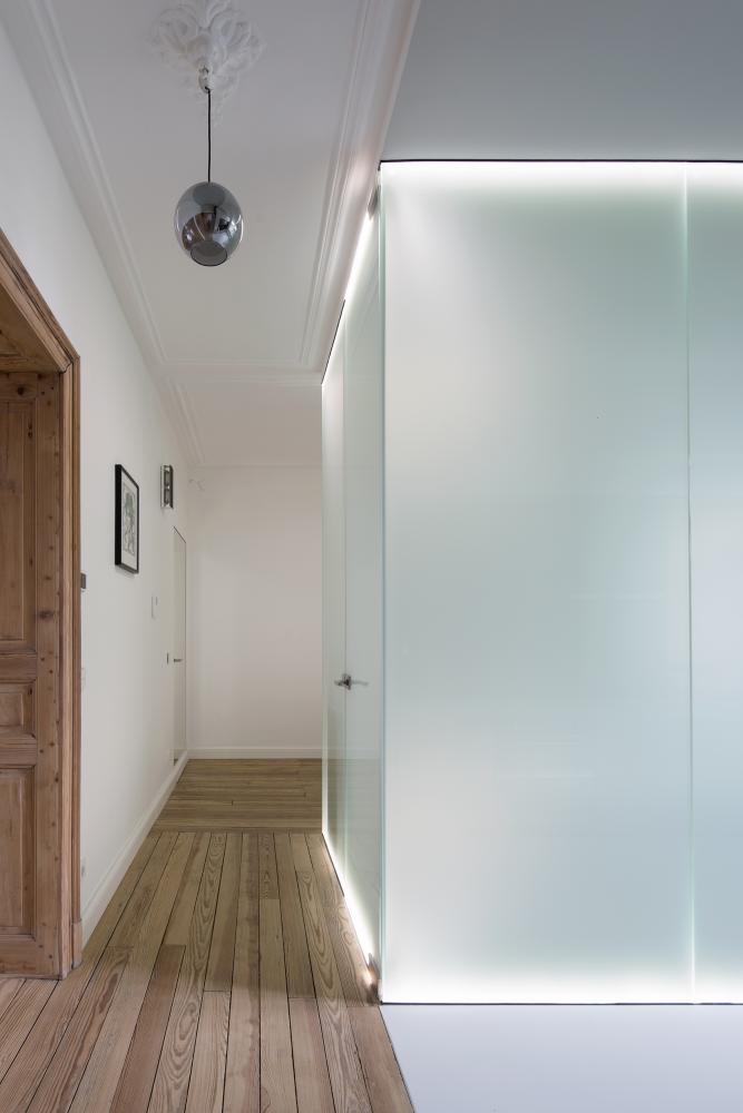 2 precise inserts redefine a contemporary dwelling comfort: a 1,5m narrow glass box integrates a separate toilet and a bathroom. The box in translucent glass is as much a spatial as a lighting element, separating and framing an open kitchen from the entrance.