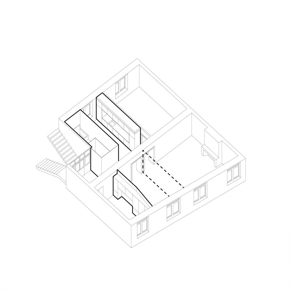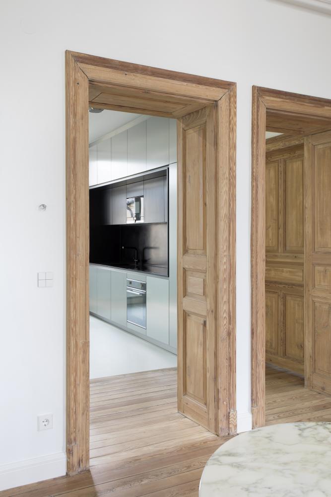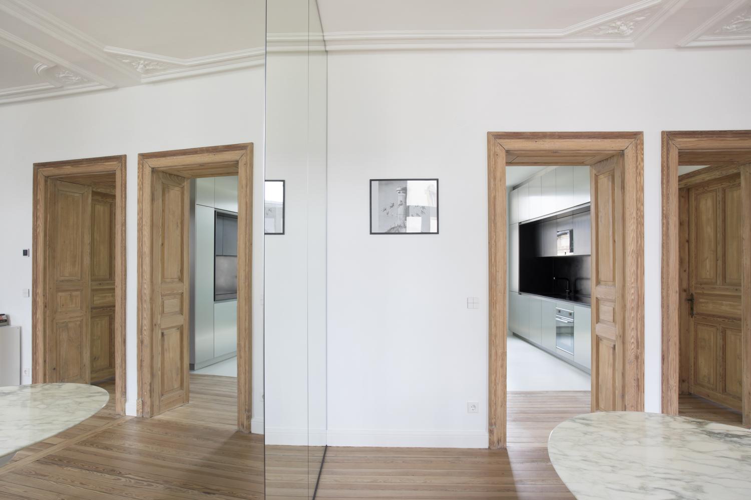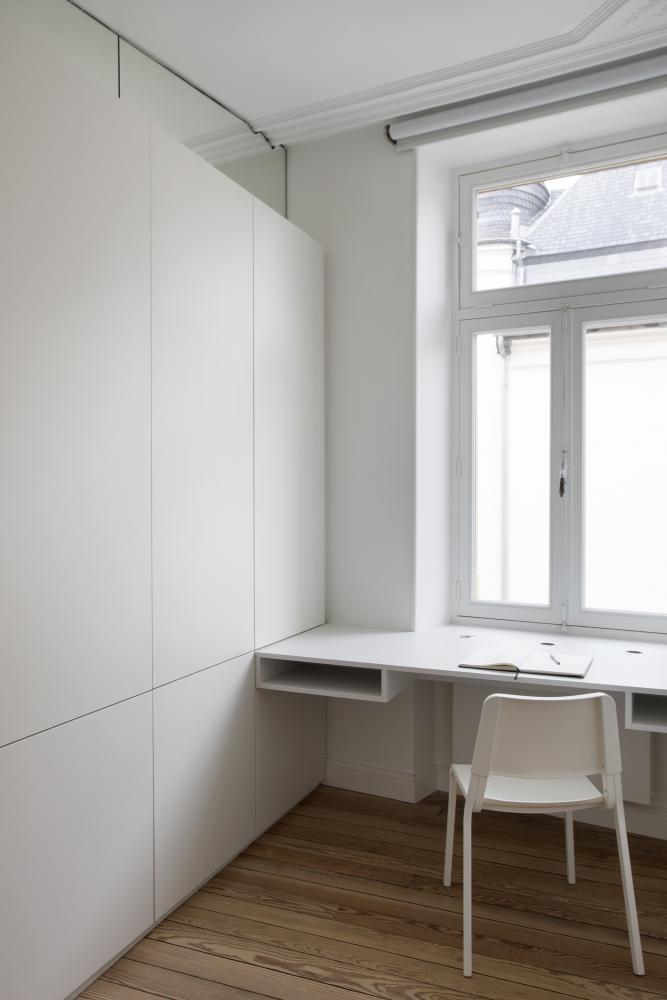 2 precise inserts redefine a contemporary dwelling comfort: a 1,5m narrow glass box integrates a separate toilet and a bathroom. The box in translucent glass is as much a spatial as a lighting element, separating and framing an open kitchen from the entrance.
