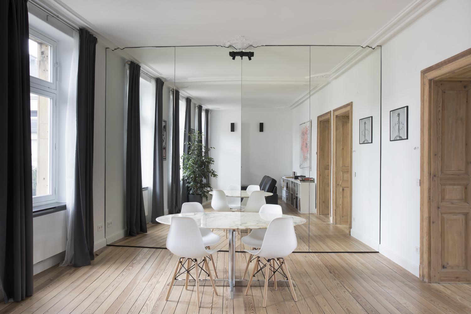 In the living room, a folded mirrored wall reflects and thus visually doubles the irregular space.
