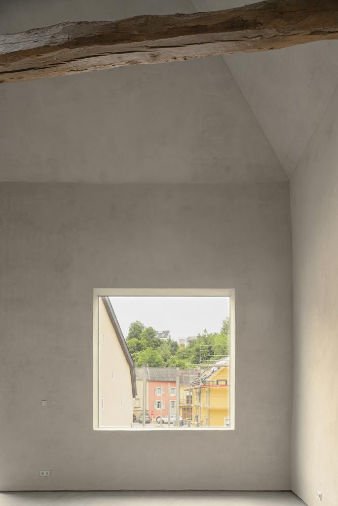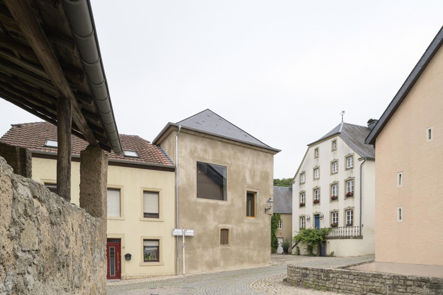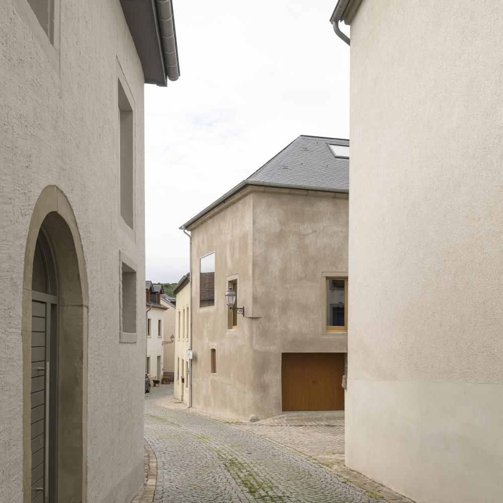 In the historic centre of Ehnen, along the Luxembourgish Moselle and near an old mill, a hybrid structure brings together a former notary’s office and a viticultural barn under one roof. A young winemaker envisioned this space as her future home.