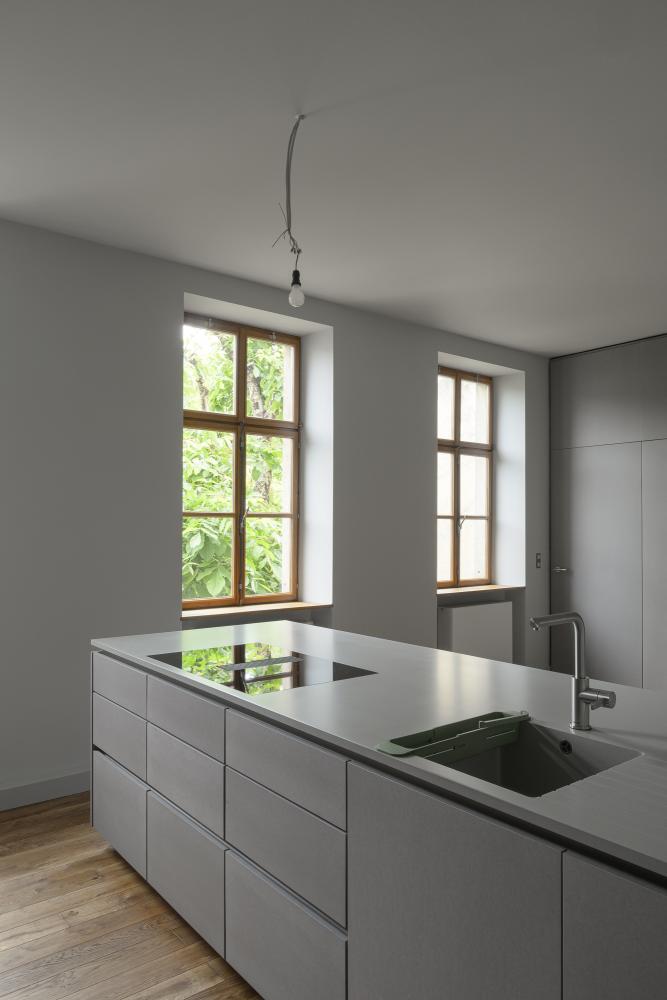 On the first floor, the notary’s office has been transformed into a tuned-down kitchen and dining area, aligned with the grid of the original windows. These openings were carefully preserved and upgraded with integrated double glazing.