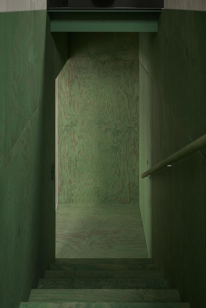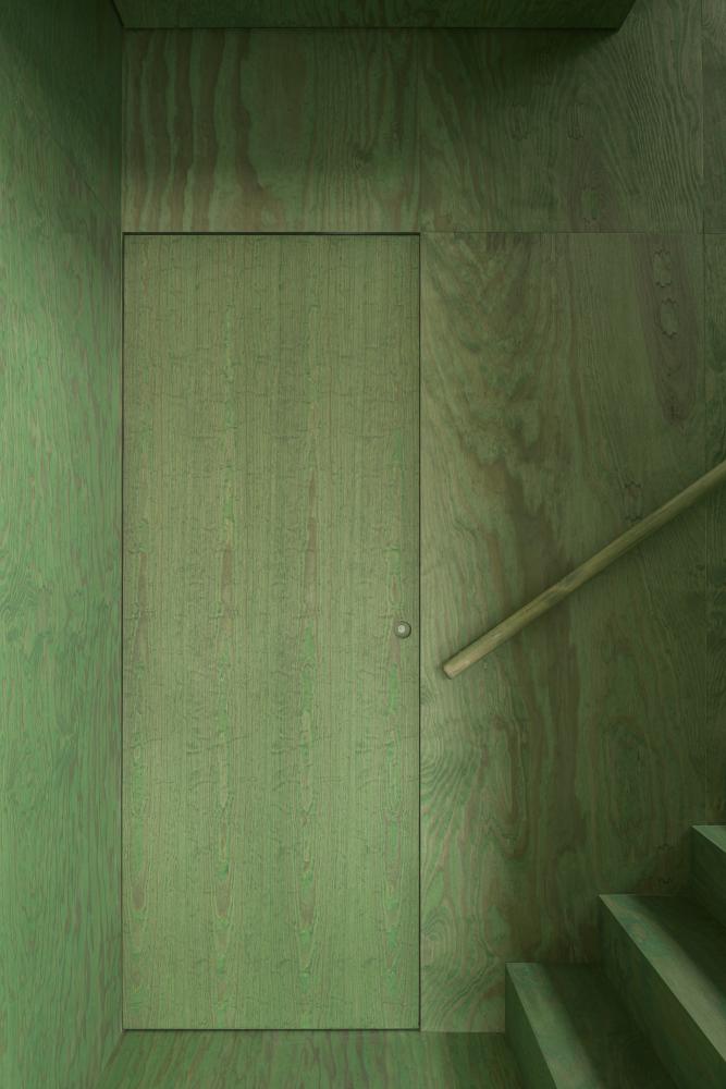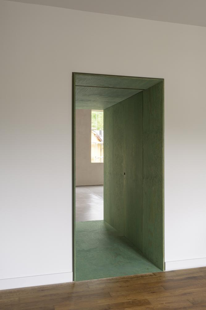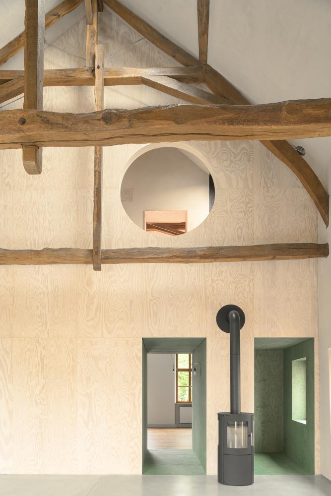 A passage was carved through the load-bearing wall that once divided barn and office. This newly opened tunnel, lined in green-tinted plywood, leads into the main living area; an expansive, 4-to-8-metre-high volume in the barn. The space, rendered in clay, showcases the original timber roof structure, now carefully reinforced by the engineers.