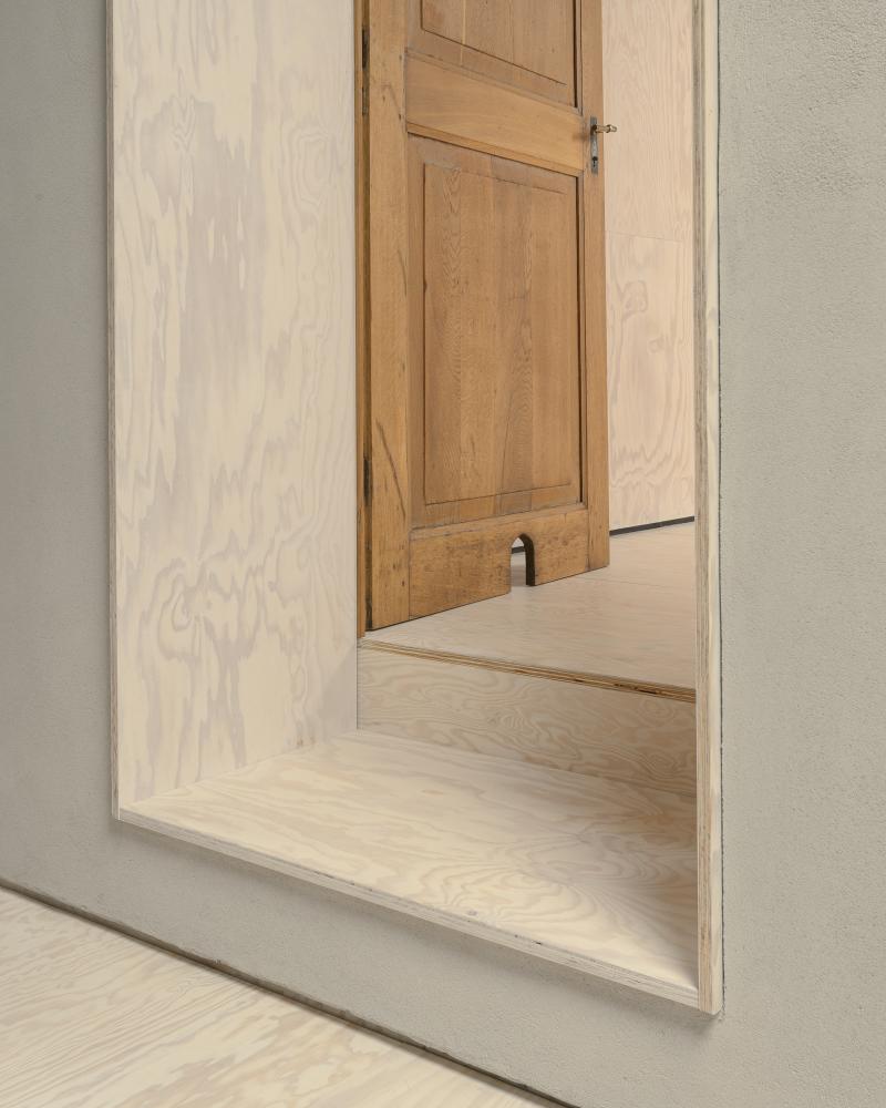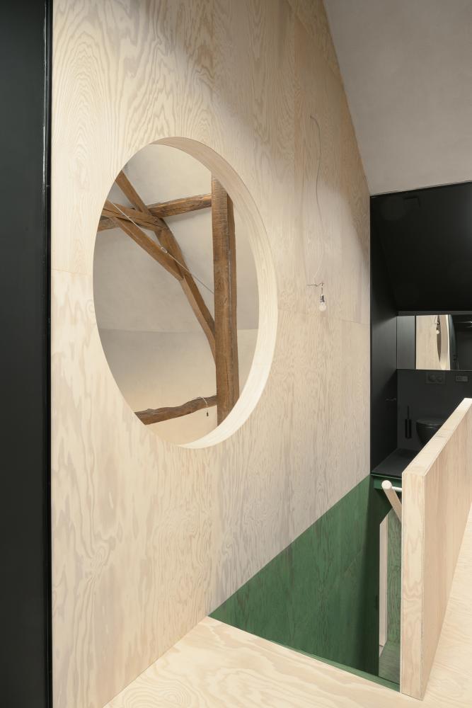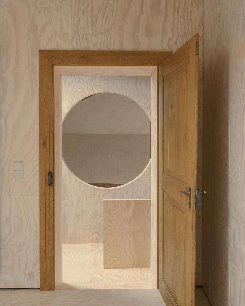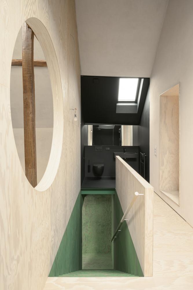 A compact timber insertion accommodates the technical infrastructure and vertical circulation. It houses an office, a separate toilet, a technical room, and laundry on the first floor, with a bathroom, a second toilet on- and the stairwell to- the floor above. This architectural volume is placed within the barn along the existing structural wall, defining and organizing the space.
