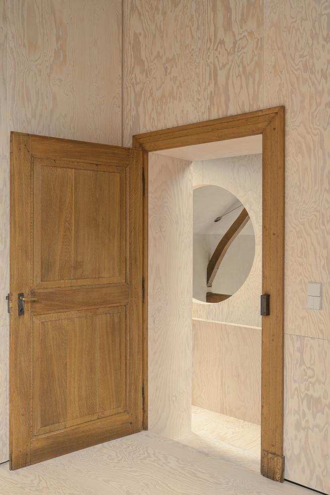 From here, two bedrooms are accessed through restored and reused doors, opening onto timber-clad interiors beneath the historical roof structure.