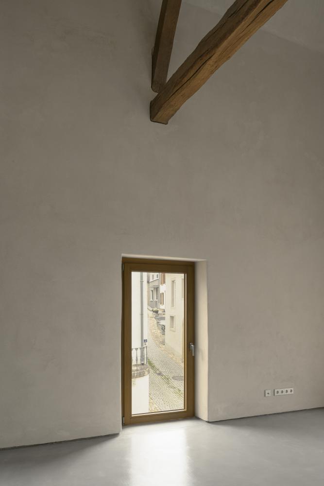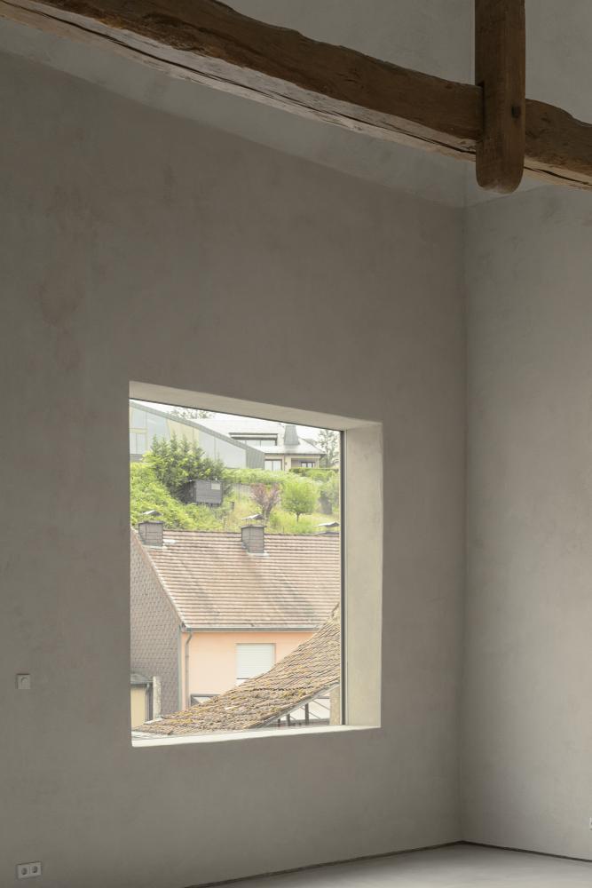 All original openings have been reinterpreted with new windows. One large, square bay punctures the façade, framing the surrounding wine hills and vernacular buildings in a single, intentional gesture.