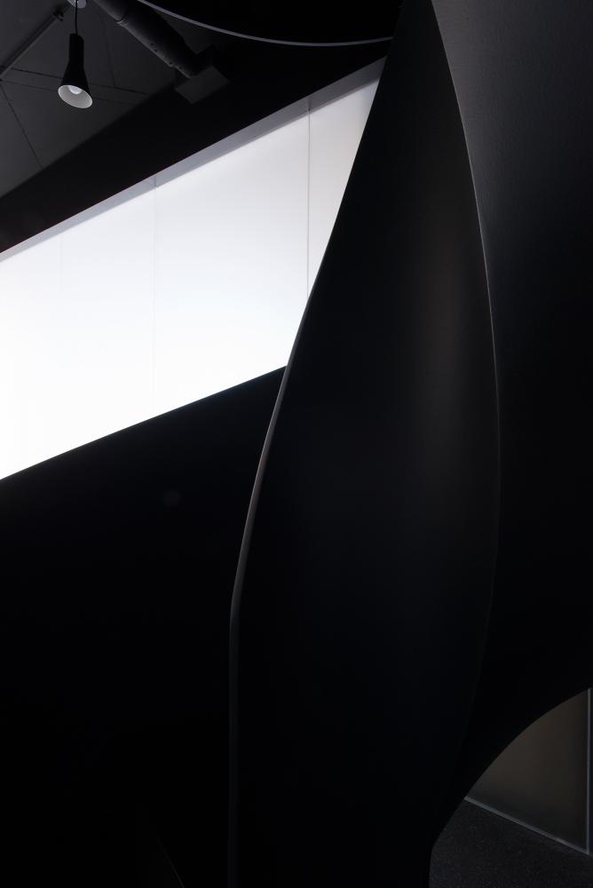 Upon entrance, clients, visitors and employees find themselves in a generous rectangular volume, a pure space devoid of sales content or furniture, that is set diagonally in the existing building to allow for maximum dimensions.