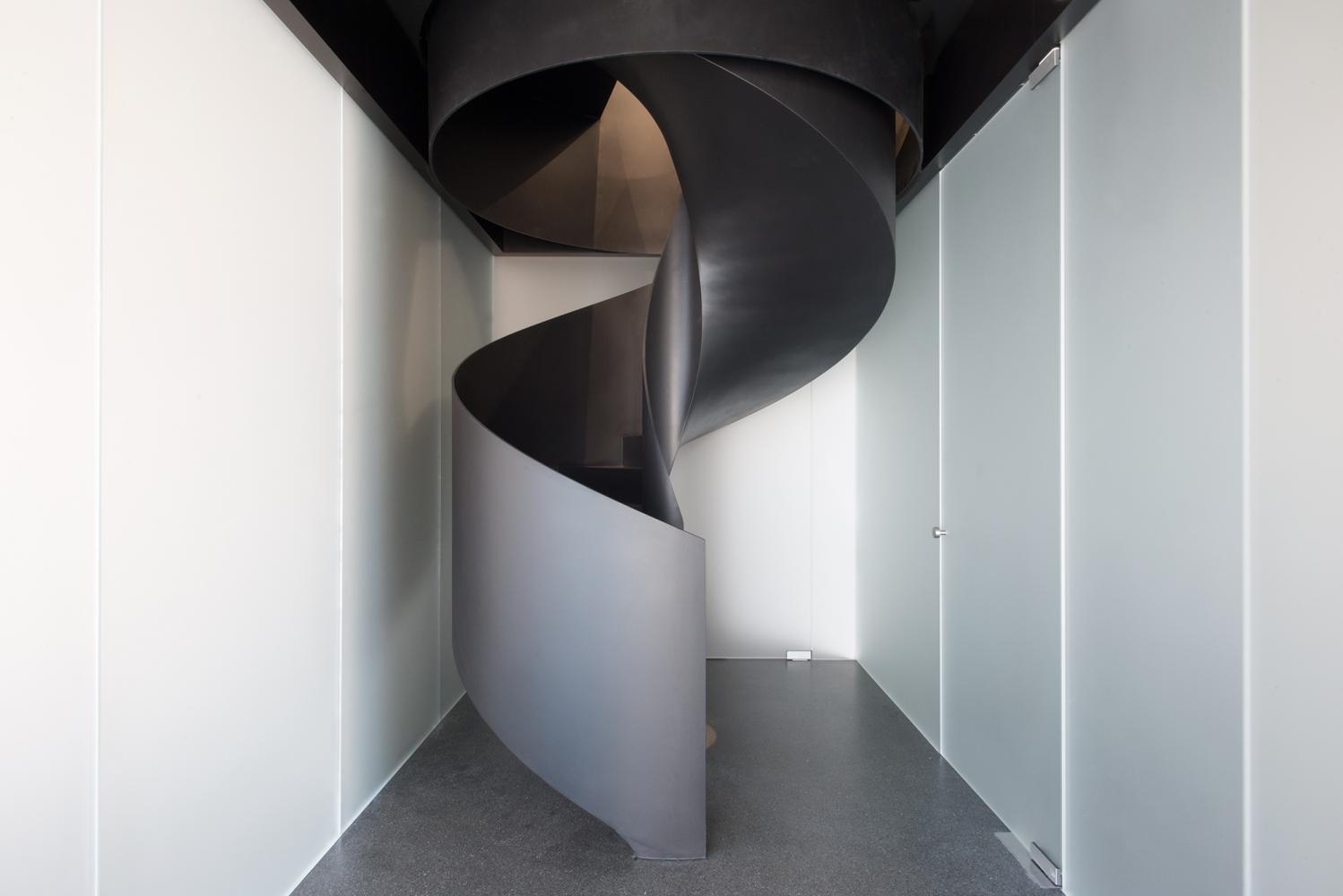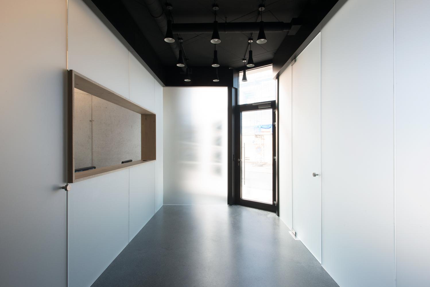 This space determines and distributes the reception desk and meeting room as much as the technical and service spaces, while giving access to the offices on the first floor.