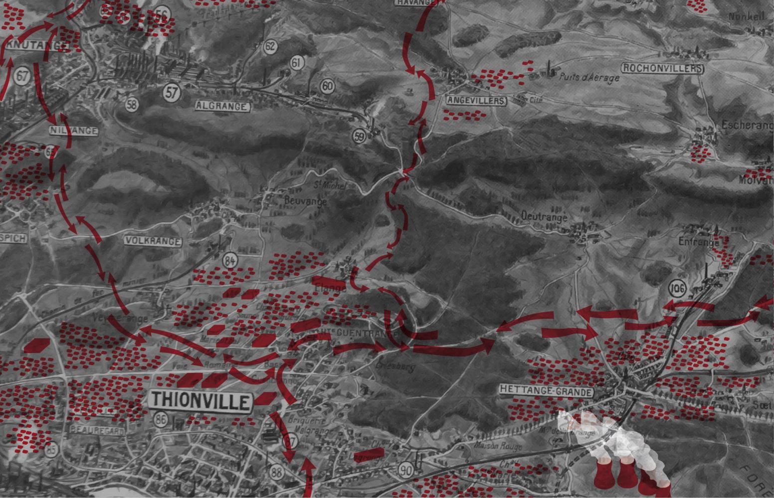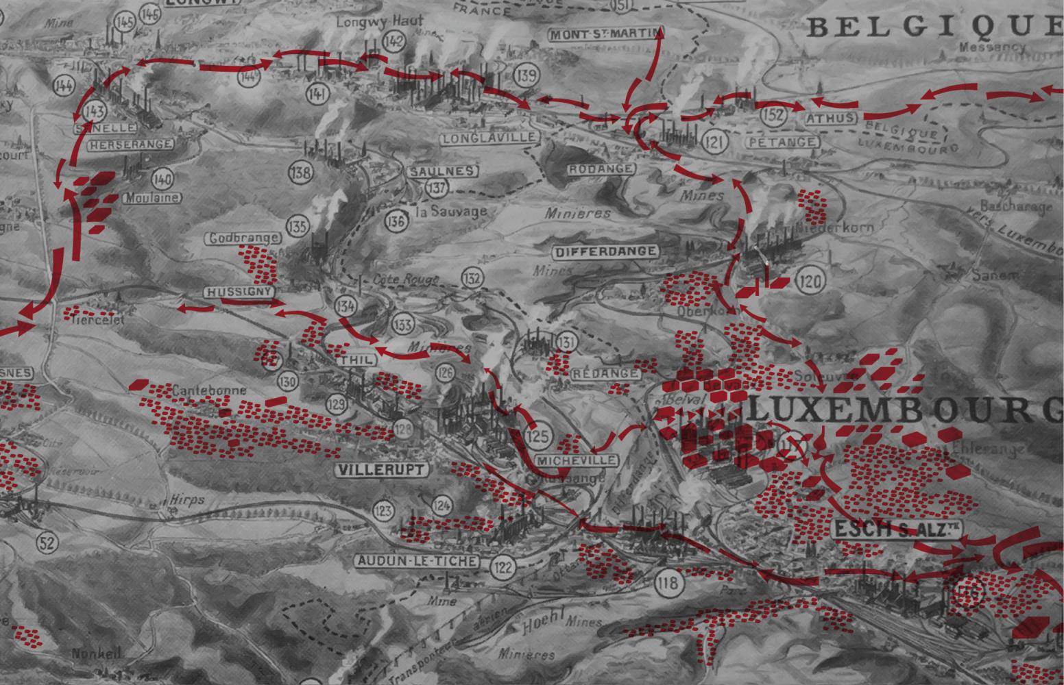 (carte indique le complexe industriel (minier et sidérurgique) du début du 20ème siècle. Un complexe qui se débarrassait des frontières. Ces héritages, ainsi que les nouveaux développements résidentiels qui hébergent une majorité des frontaliers travaillant au Luxembourg, définie une potentielle métropole. Aujourd’hui nébuleuse et méprisée, elle pourrai redéfinir notre cadre de vie au profit de tous…)