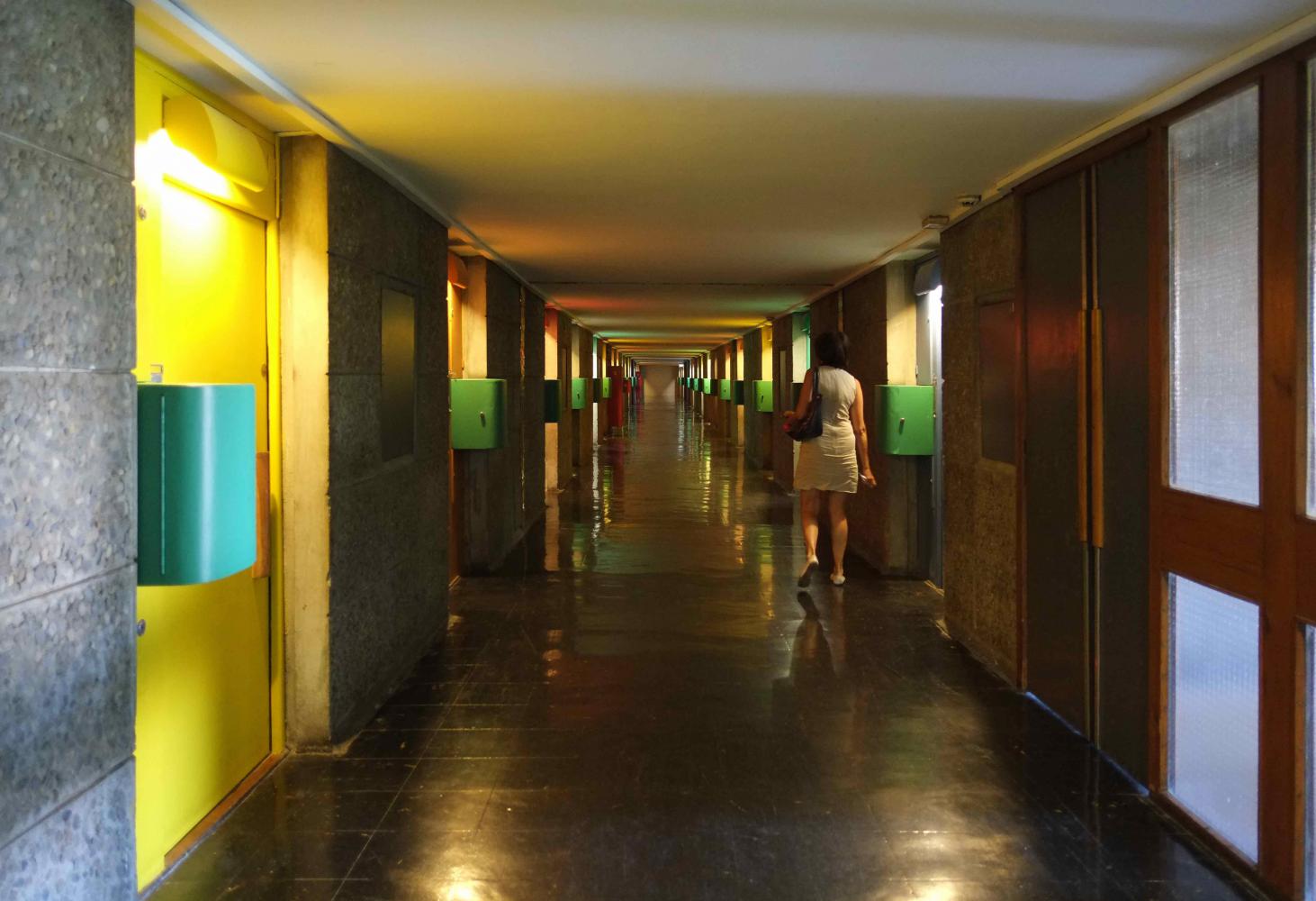 “Look, one more wonder. The dark atmosphere produced by the soft lighting of the corridor makes people speak very quietly. Like this, one doesn’t disturb the neighbors. It is also an excellent tranquilizer after a long day of work before to reach the family cell. A moment of procession in the calm… living at the Unité is definitely on the edge of living a mystical experience.”