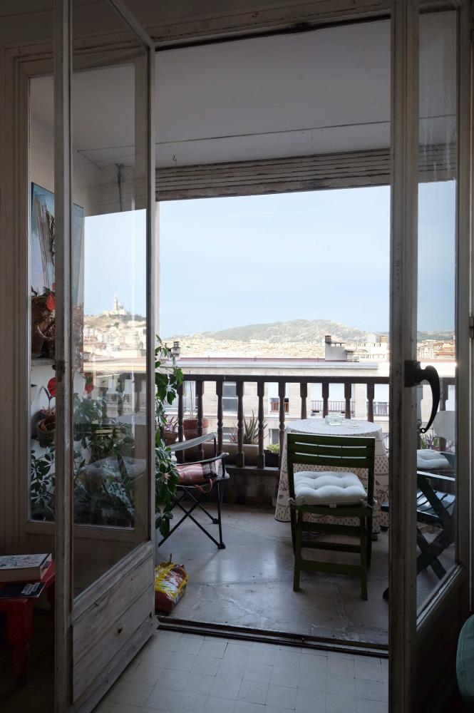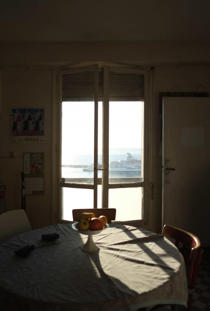 That view, onto the Mediterranean sea and the ferries that link Marseille to Algiers, slowly entering or leaving the harbor.