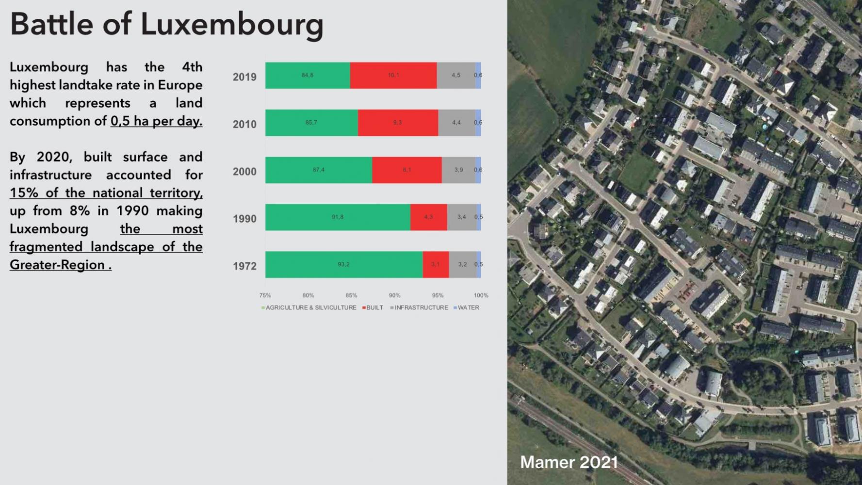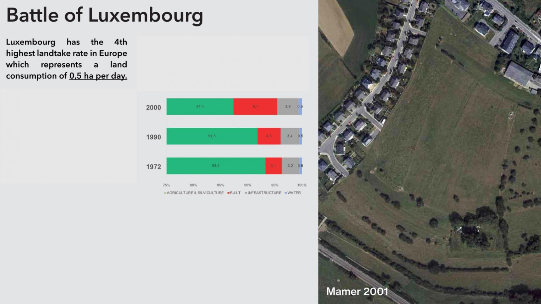 Luxembourg has the 4th highest landtake rate in Europe (EEA,2019) which represents currently a land consumption of 0,46 ha per day (Fourmann and Tholl, 2019). If the built footprint grew from 1,63% to 1,74%, roads and parking spaces flourished at the same time from 5,73% to 6,24% of the territory (Liser, 2013), making Luxembourg the most fragmented landscape of the Greater-Region .