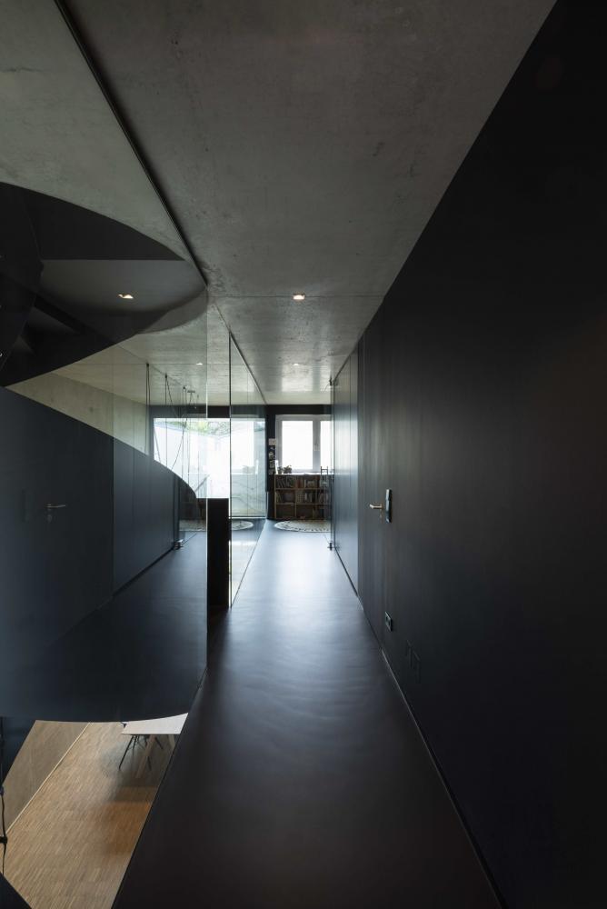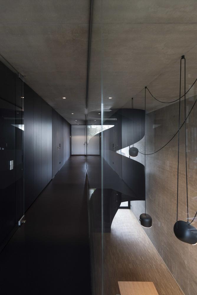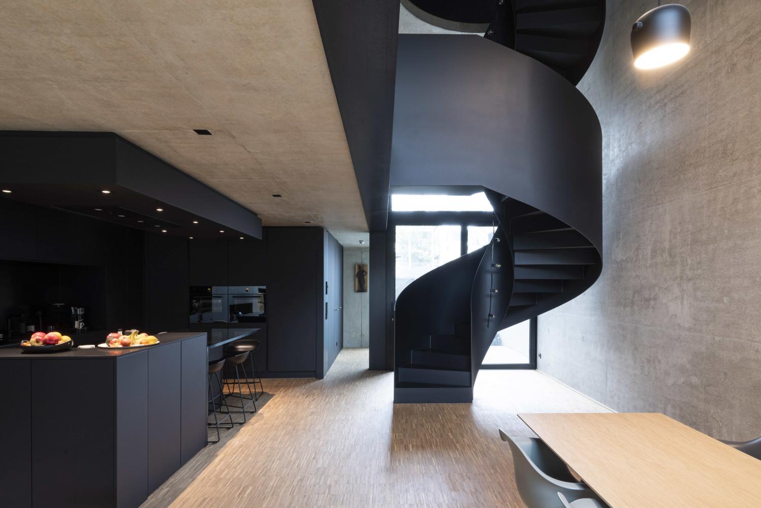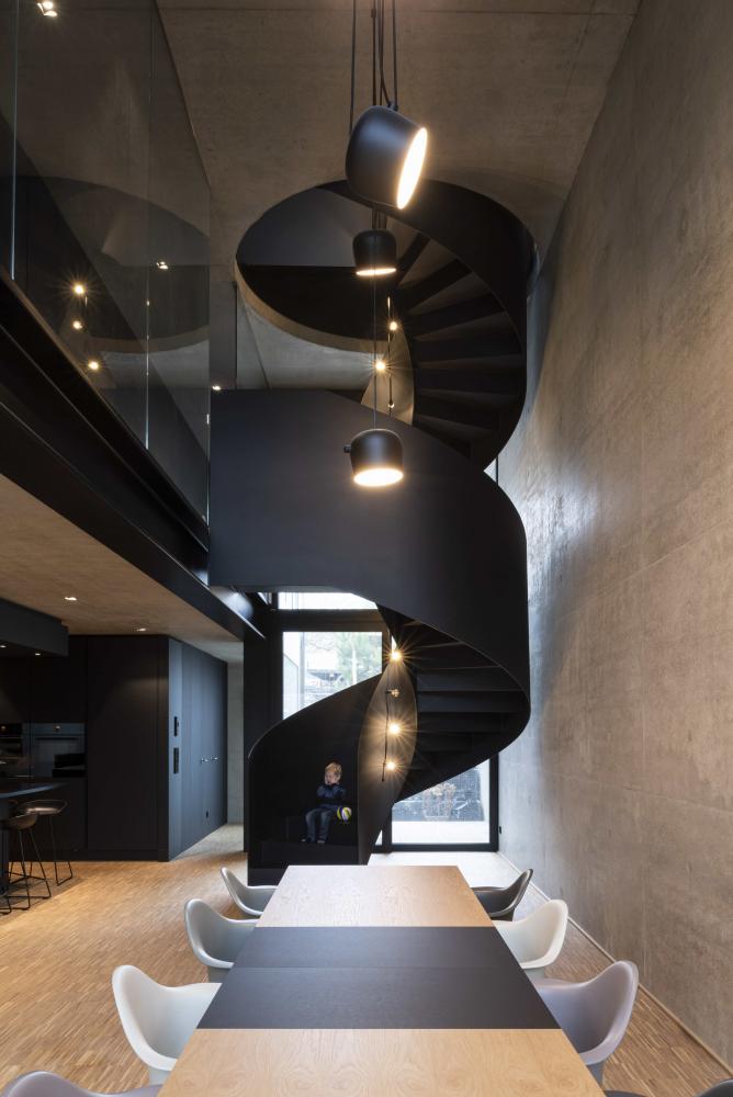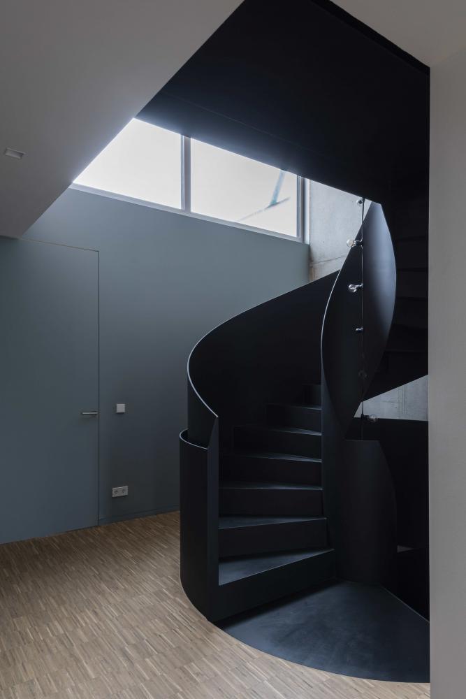 Like a screw, the spiral staircase links the four floors and their various functional and spatial conditions. It is the constant in perpetual change of this terraced house.