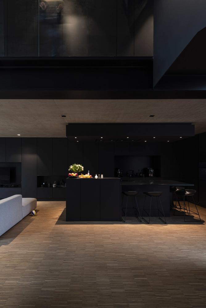 Suspended in this large space, a volume includes the entrance, the garage, the technical room and an office. Under this volume, which would usually be the cellar, a large living space benefits from the entire surface of the footprint. Kitchen, dining room and living room are only differenciated by the different ceiling heights and the staircase.