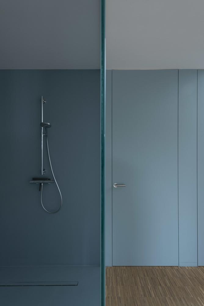 The last recessed level houses the master suite, organizing bedroom, dressing room, toilet and bathroom around a single furnished partition.