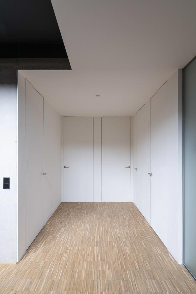 The first floor cantilevers from the main plan layout to create an awning at the entrance and accommodate four large bedrooms, a bathroom and a laundry room. A double-height landing takes natural light from the facade of the last level to benefit the bathroom in the center of this level.