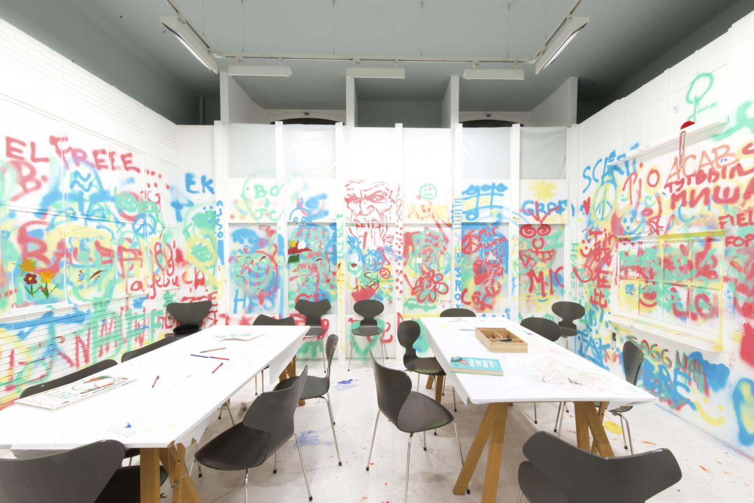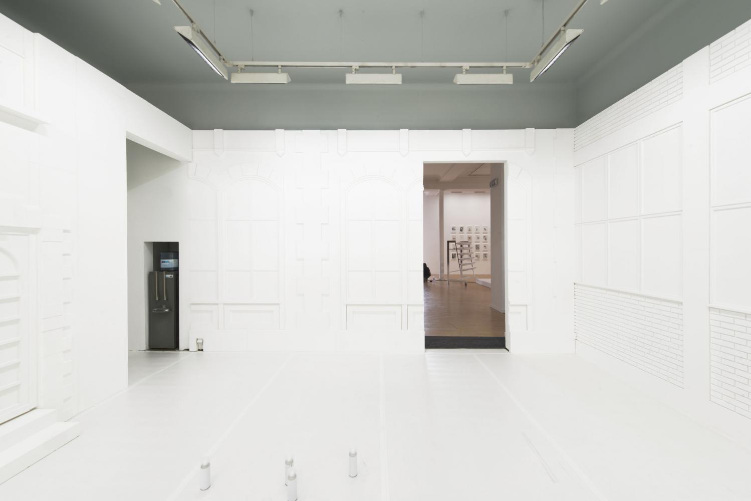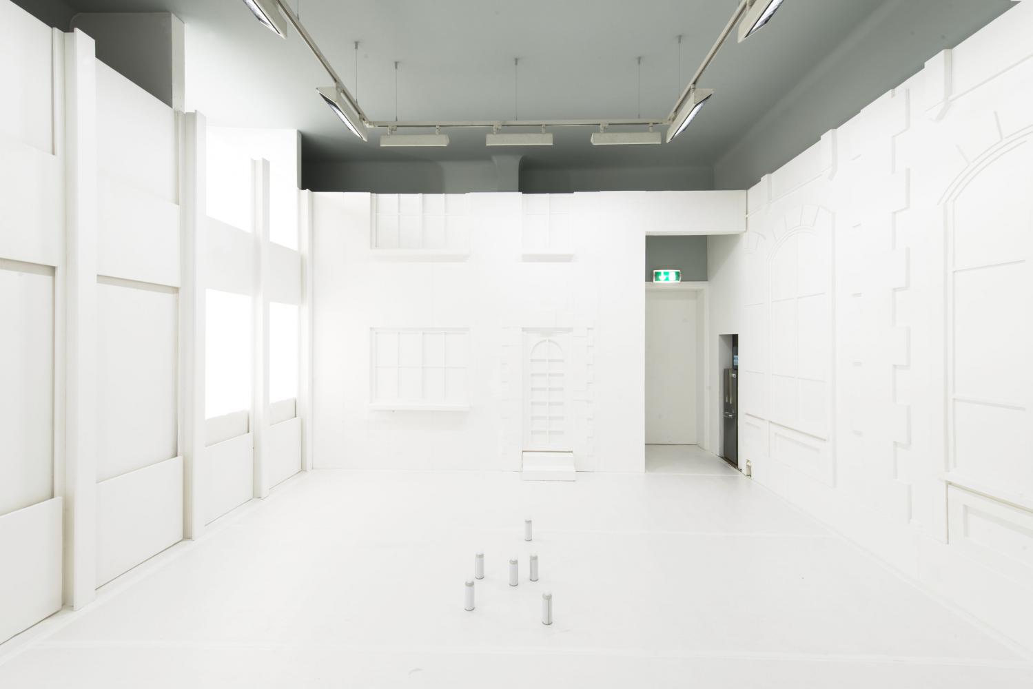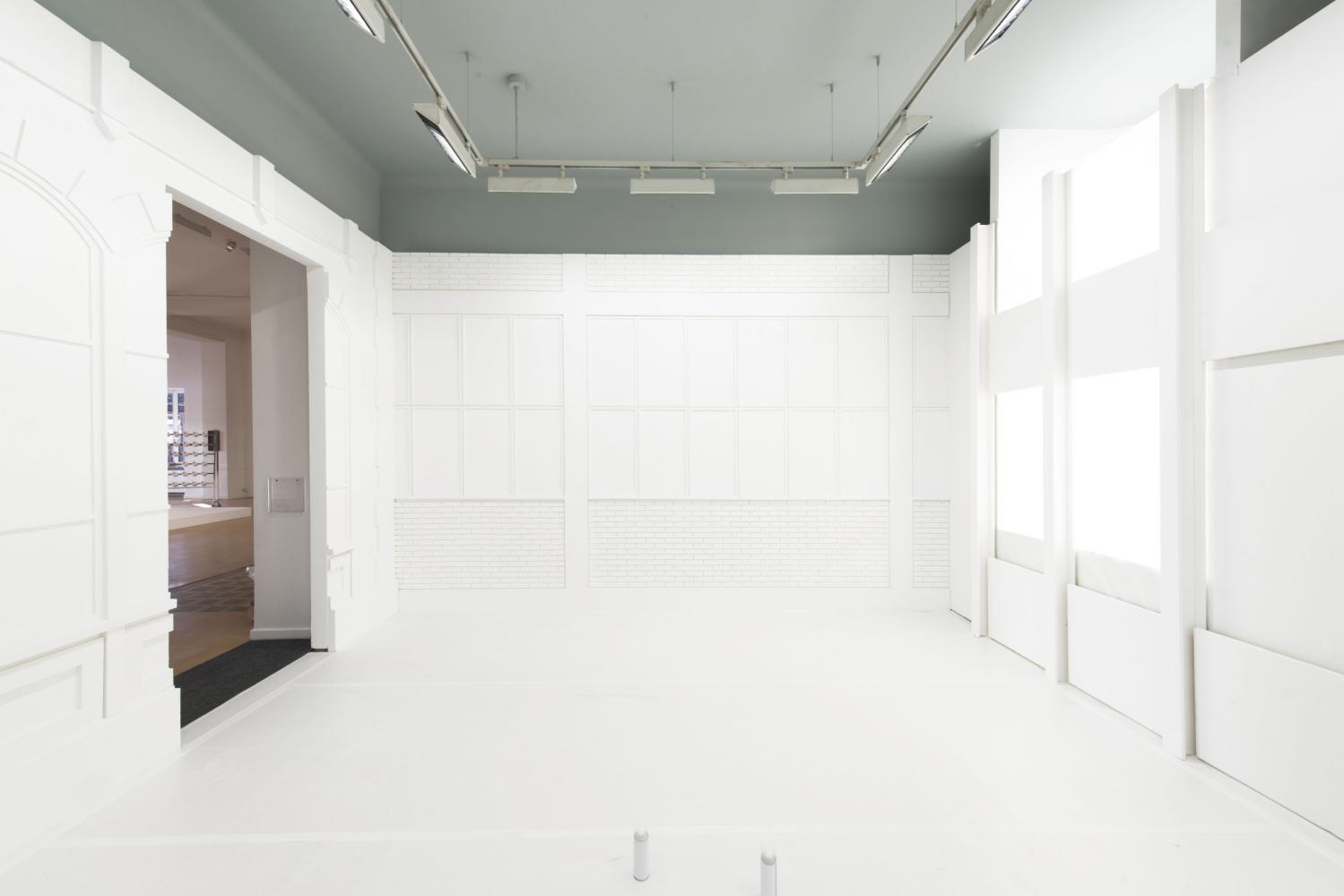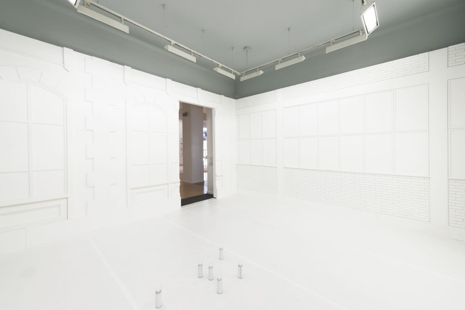 Commissioned to animate the walls of LABO, the space dedicated to educational programs at the art forum, “plan section ELEVATION 1:1,5” consisted out of 4 façades of iconic building typologies. A 1950’s factory, a modernist office building, a neo-classic palace, and a vernacular house were reduced by a 1,5 factor to bring them to a children’s scale. 4 white spray cans were disposed on the floor of the white cube, inviting visitors to appropriate the interactive installation.