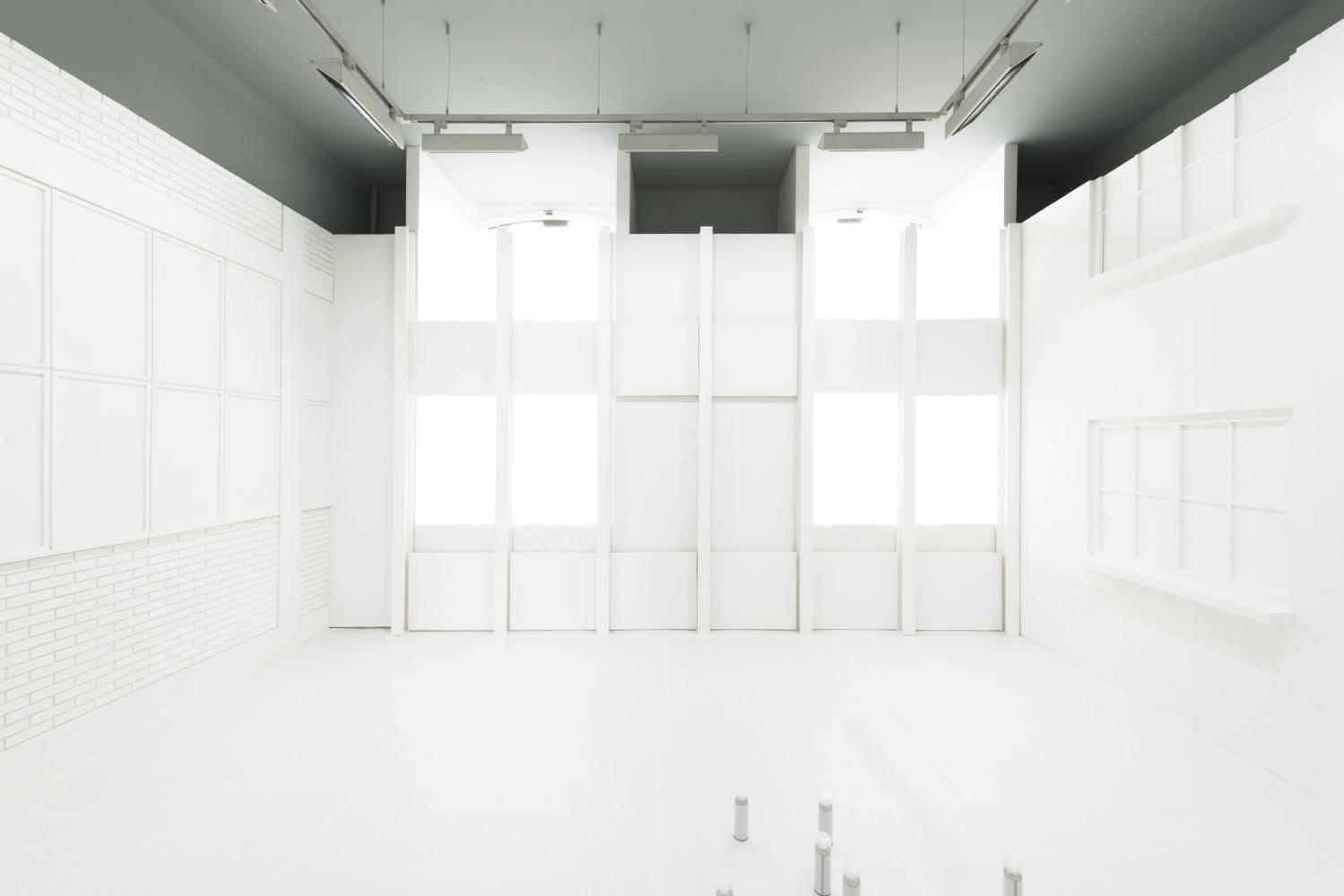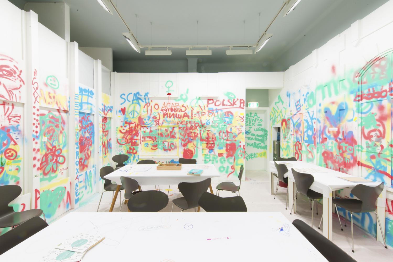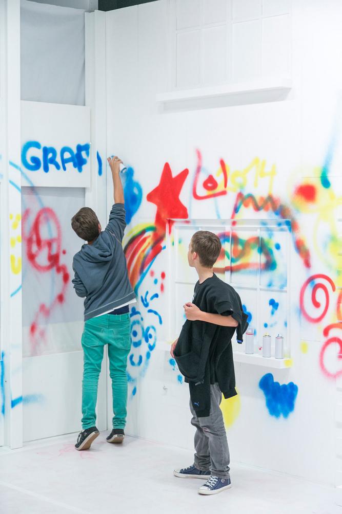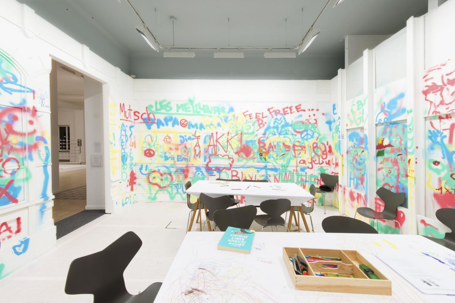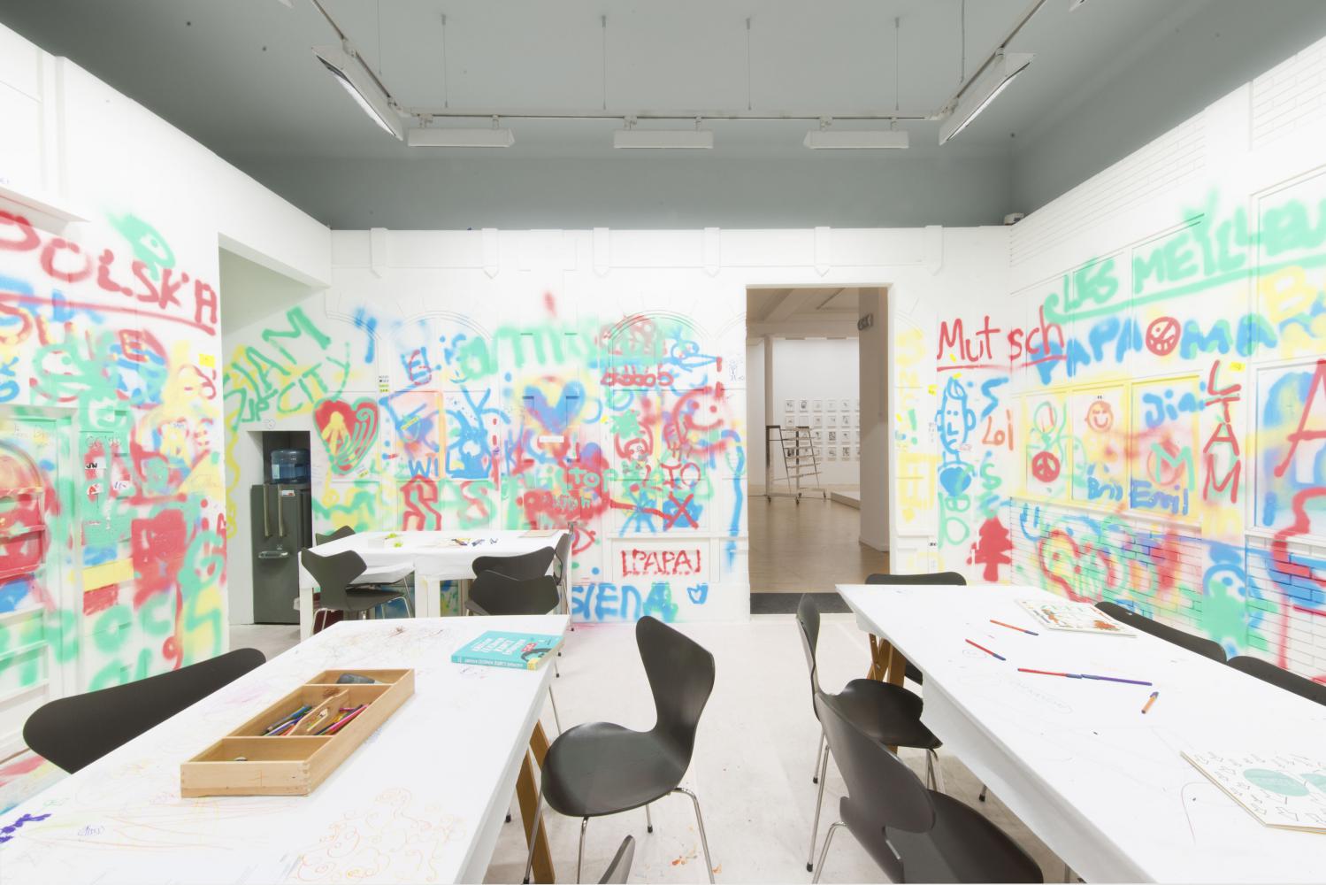 Commissioned to animate the walls of LABO, the space dedicated to educational programs at the art forum, “plan section ELEVATION 1:1,5” consisted out of 4 façades of iconic building typologies. A 1950’s factory, a modernist office building, a neo-classic palace, and a vernacular house were reduced by a 1,5 factor to bring them to a children’s scale. 4 white spray cans were disposed on the floor of the white cube, inviting visitors to appropriate the interactive installation.