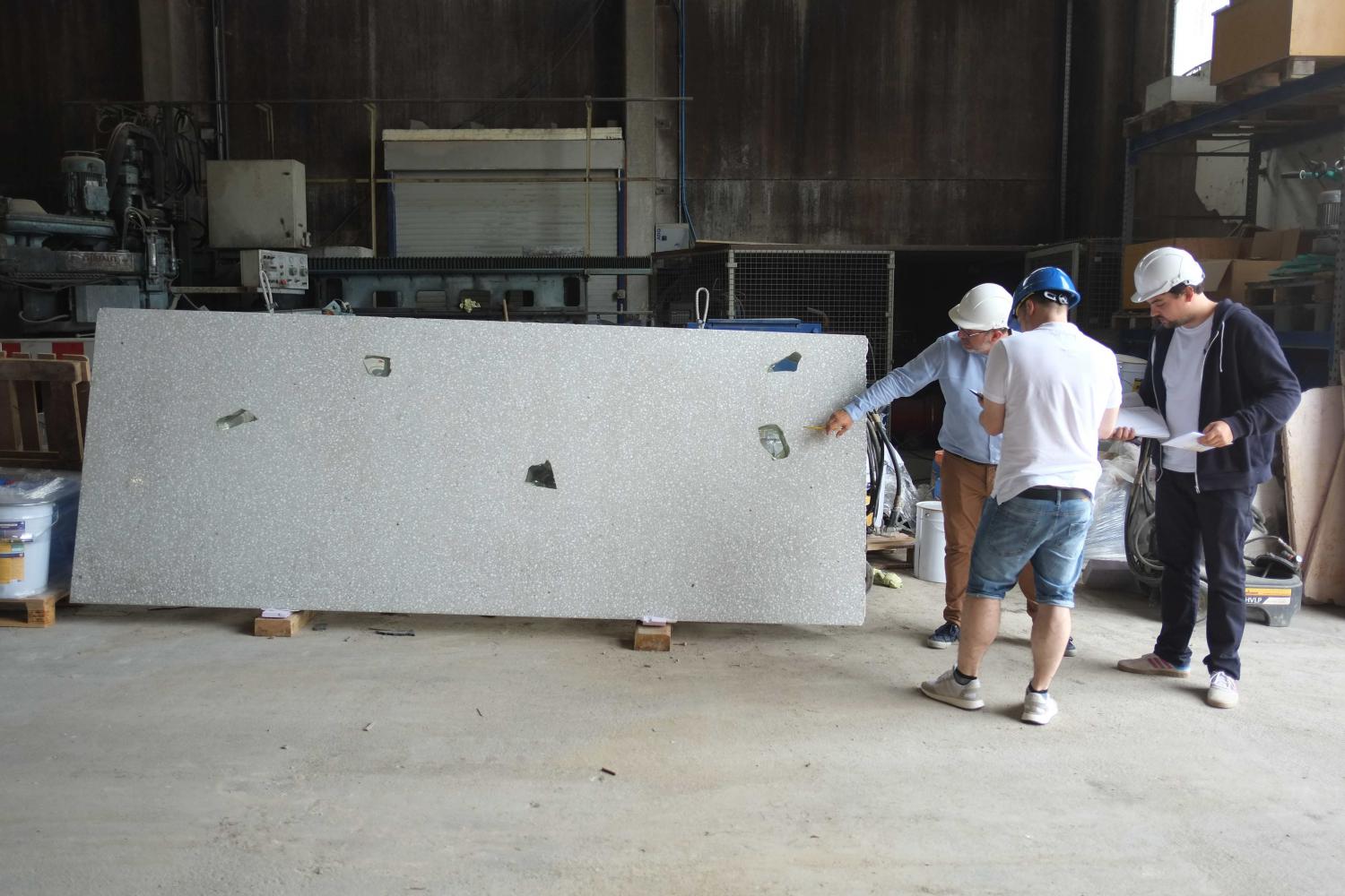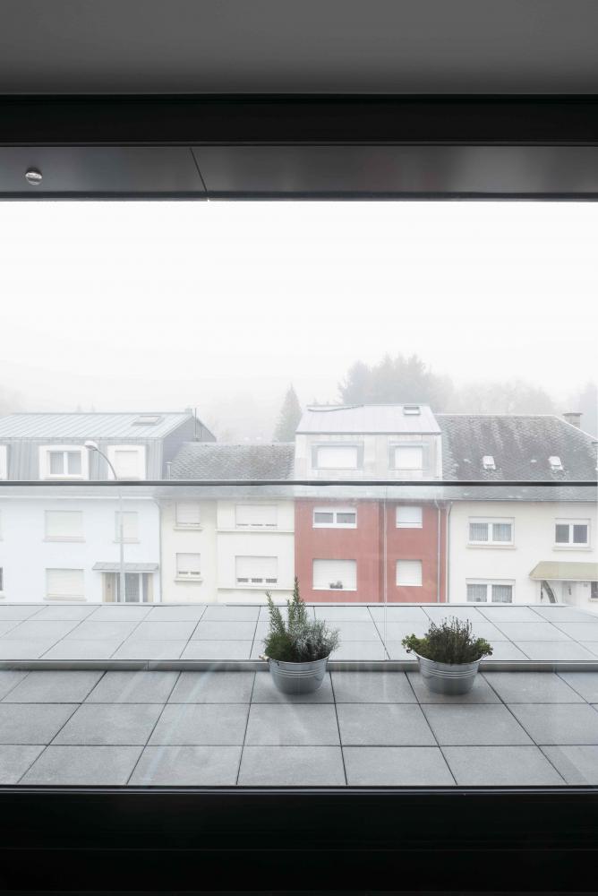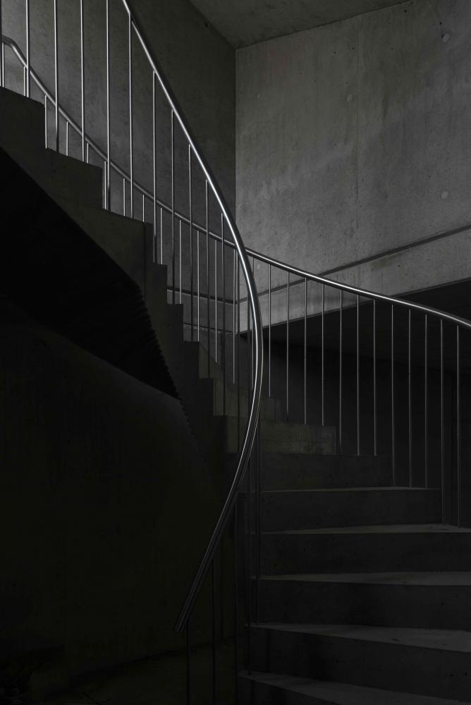Intimacy to the street is guaranteed by a railing designed in polished concrete with white stone and recycled glass inserts that let the light pass.