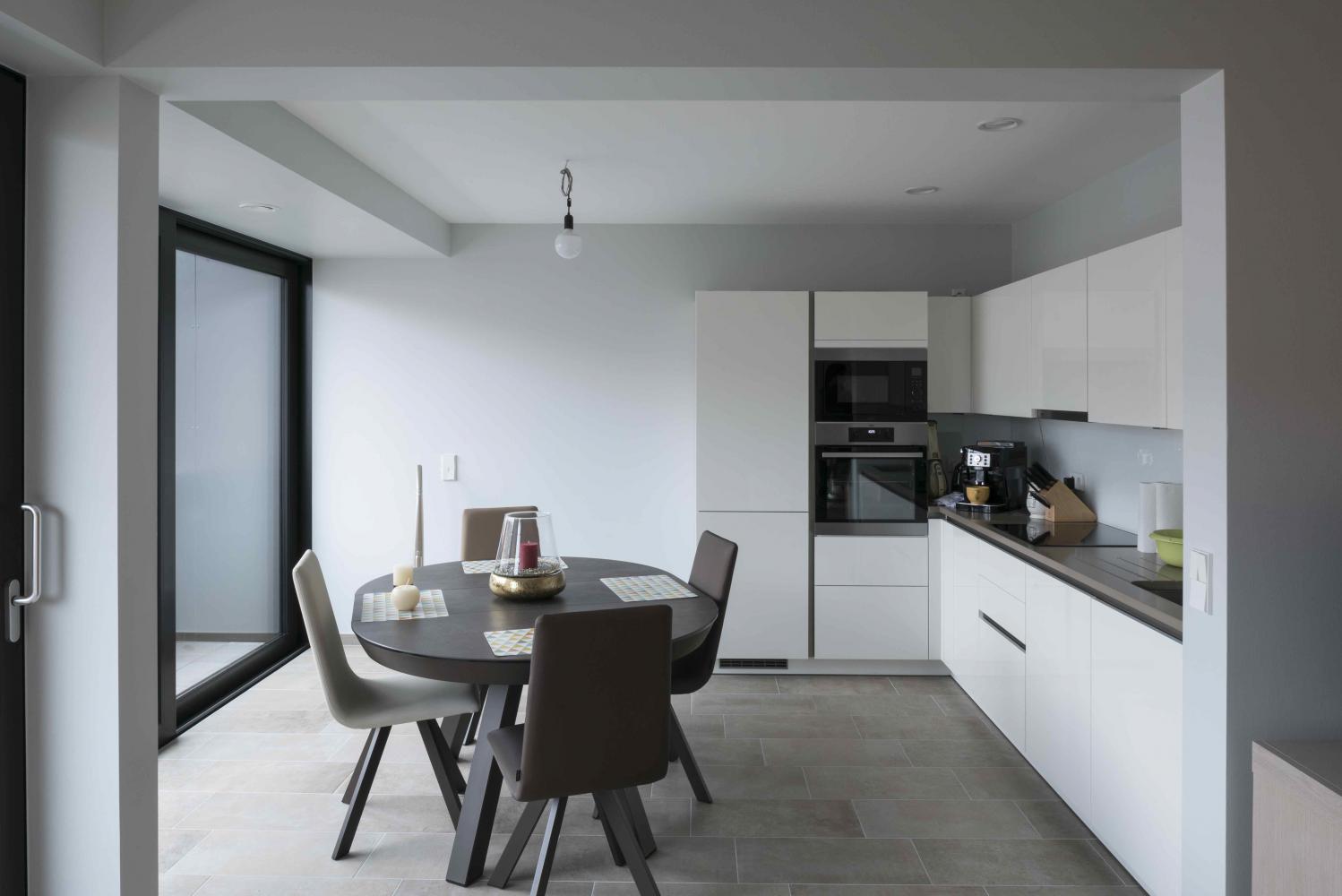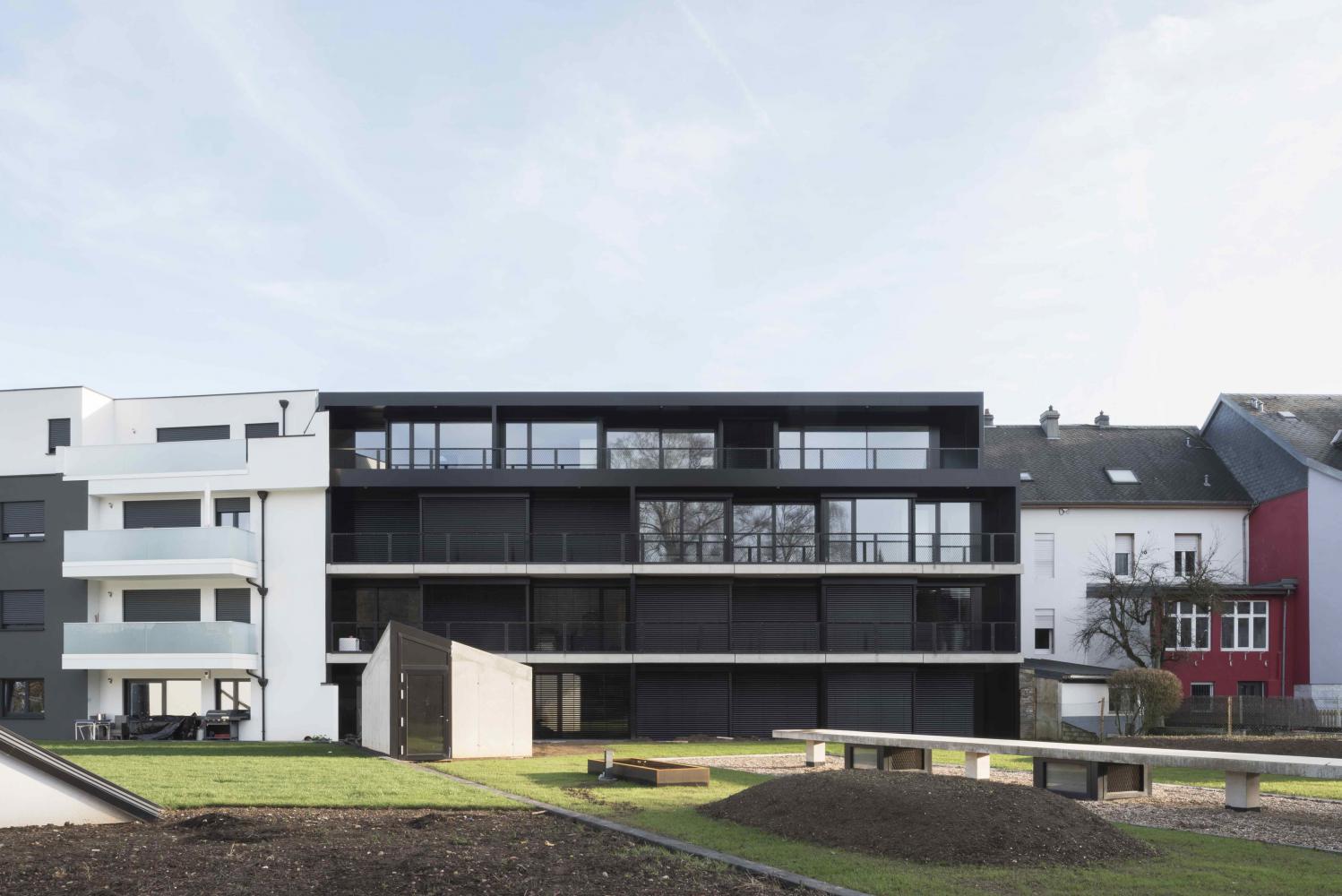 A generous spiral staircase leads to the shared garden on top of the park deck. There, a 20 meter long table is at the disposal of all inhabitants, and acts as ventilation and lighting for the garage at the same time.