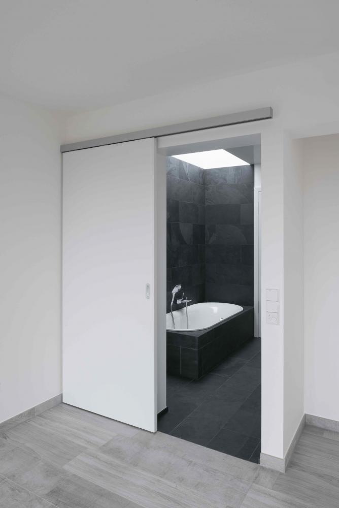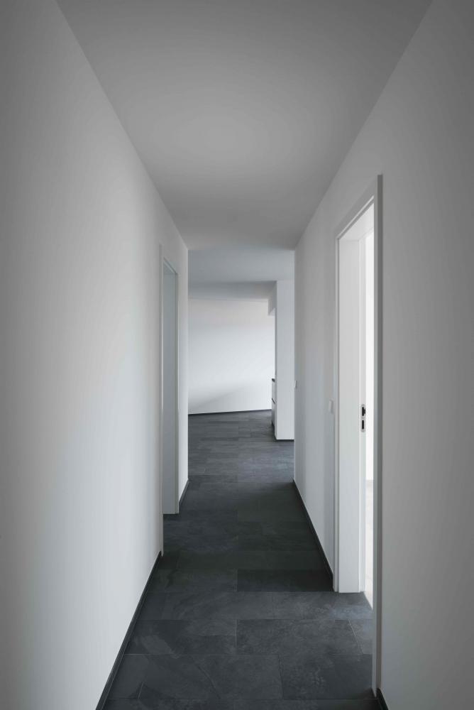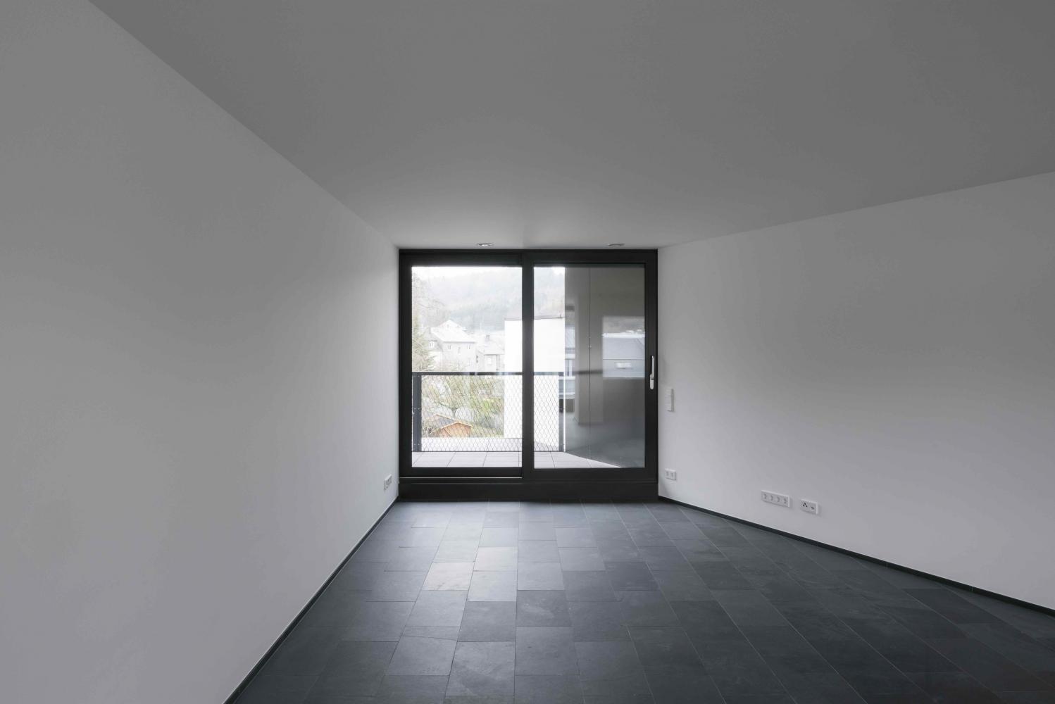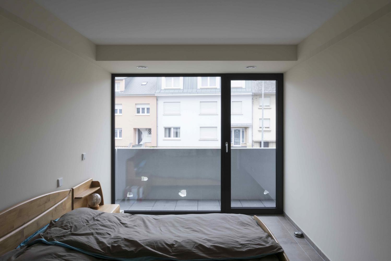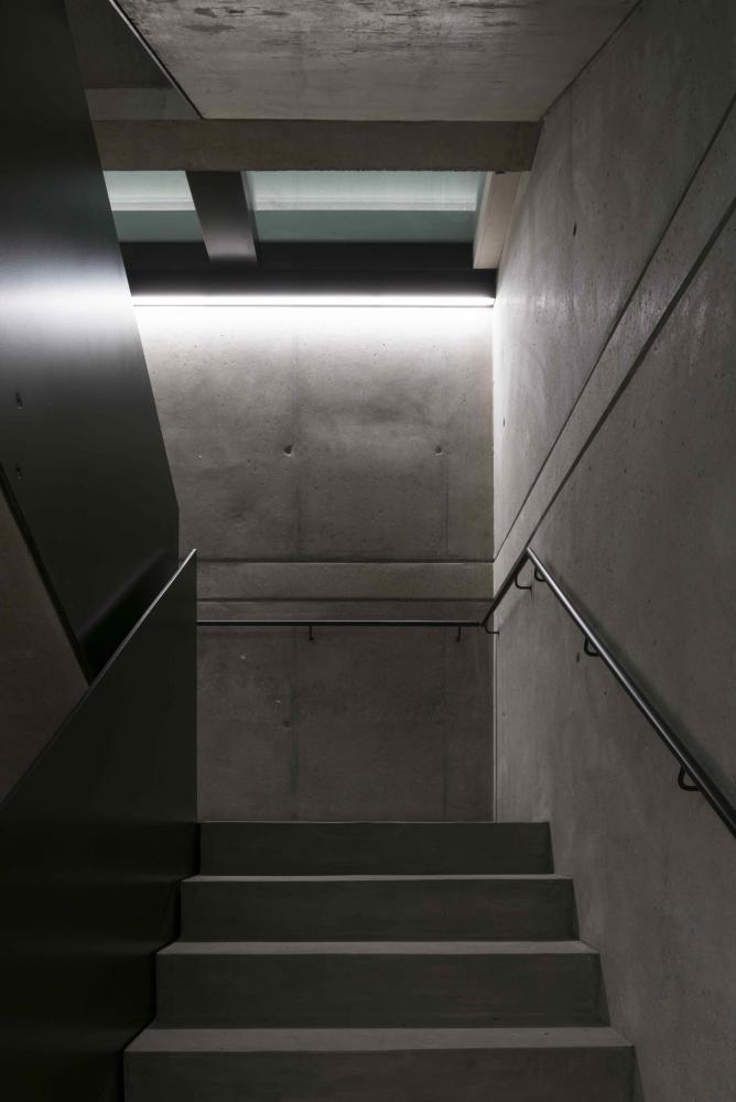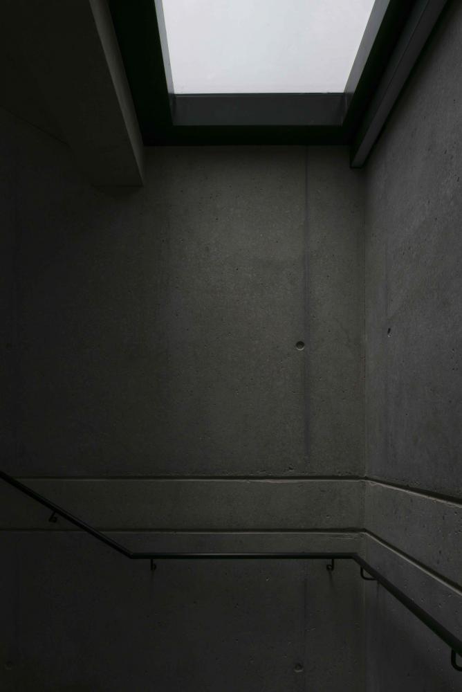 Shared circulation spaces are compressed to a vital minimum at the center of the building, lit by a skylight and glass landings in the staircase.