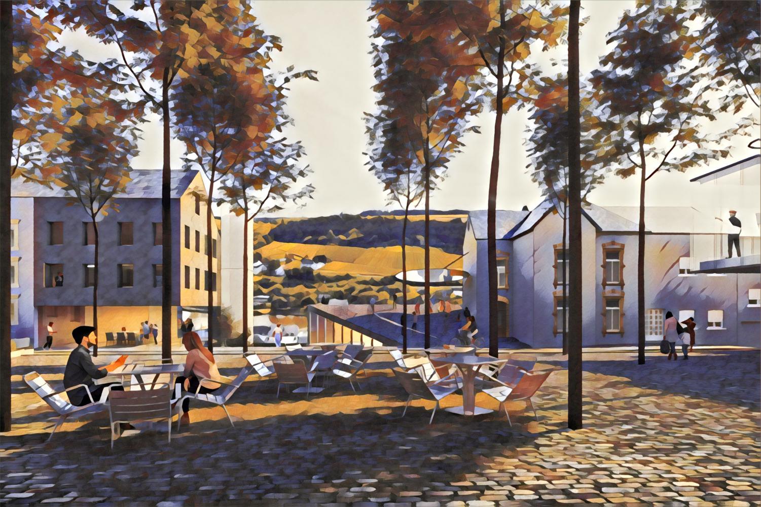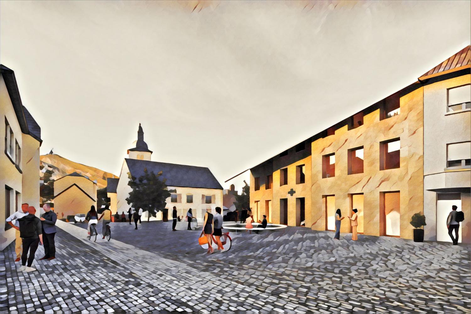 The Place Communale has been stripped of its surface parking lot to become a representative, functional and welcoming square. The former workshops make way for a kiosk-belvedere-bus stop, as well as a visual breakthrough and pedestrian link to the Moselle.